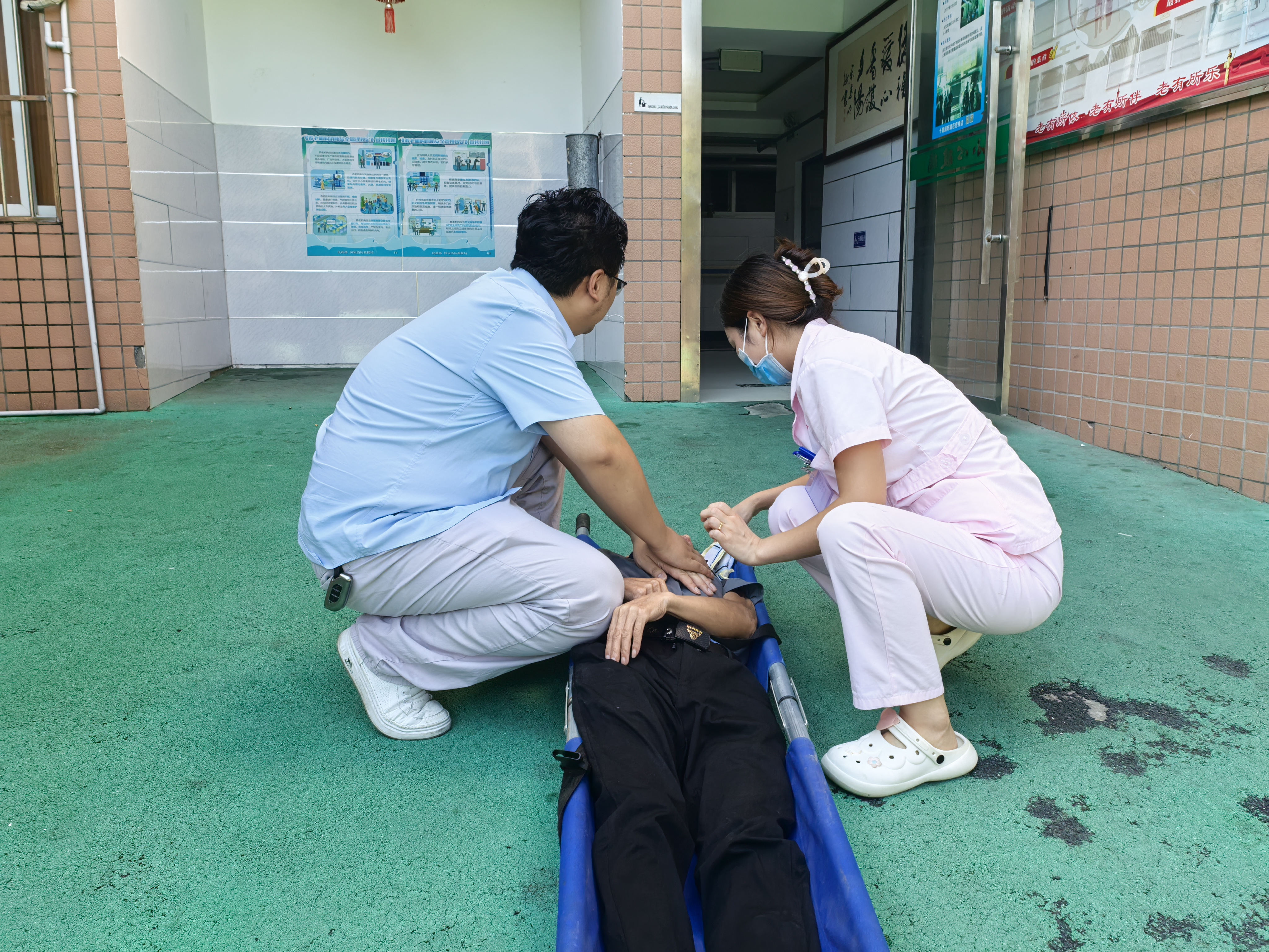 演练模拟市社会福利服务中心三号楼二楼某居室突发火情,浓烟迅速蔓延至走廊,工作人员发现险情后立即按下手动报警按钮,同步向演练总指挥报告。消防控制室接报后,迅速启动警报联动系统。灭火组成员于3分钟内携带装备抵达起火点扑救。与此同时,疏散引导组按照预定方案,沿左、中、右侧疏散通道,有序引导"院民"低姿捂鼻撤离至安全区域。医疗组同步到位,对模拟伤员实施紧急救治。各环节衔接紧密,所有参演人员均安全抵达指定区域。