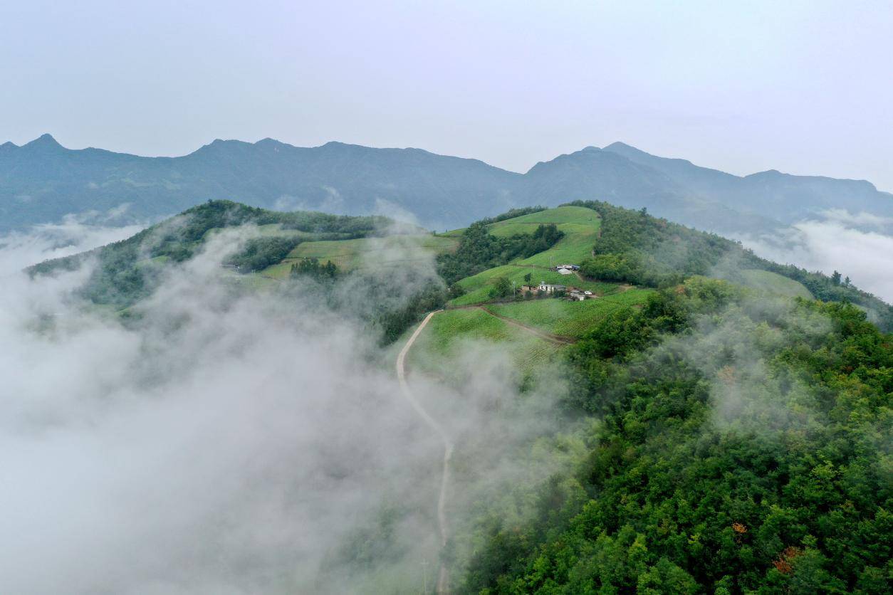 8月13日清晨,初秋时节,湖北堵河源国家级自然保护区(十堰竹山)多地村庄、道路、群山在轻纱薄雾笼罩下,若隐若现,山峦苍翠,风景如画,从空中俯瞰,呈现出梦幻般的秋晨雾景。