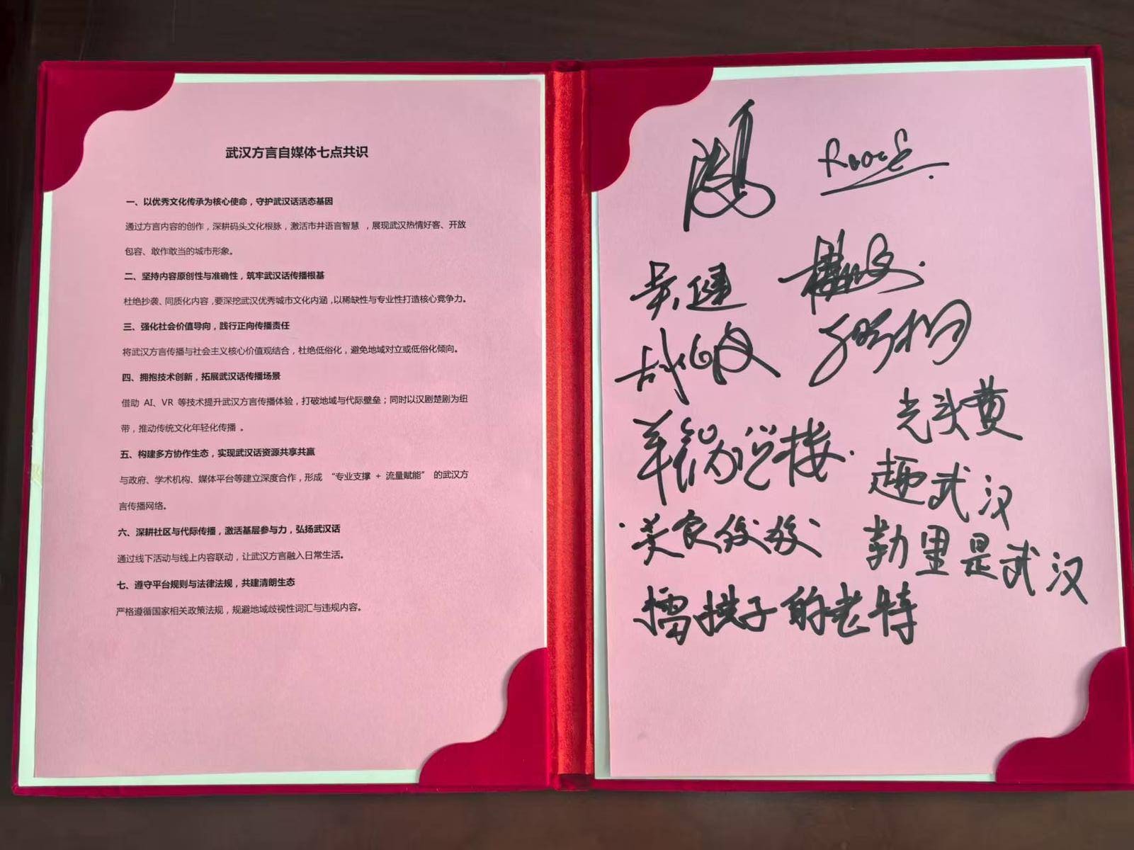七点共识包括:(一)以优秀文化传承为核心使命,守护武汉话活态基因;(二)坚持内容原创性与准确性,筑牢武汉话传播根基;(三)强化社会价值导向,践行正向传播责任;(四)拥抱技术创新,拓展武汉话传播场景;(五)构建多方协作生态,实现武汉话资源共享共赢;(六)深耕社区与代际传播,激活基层参与力,弘扬武汉话;(七)遵守平台规则与法律法规,共建清朗生态。