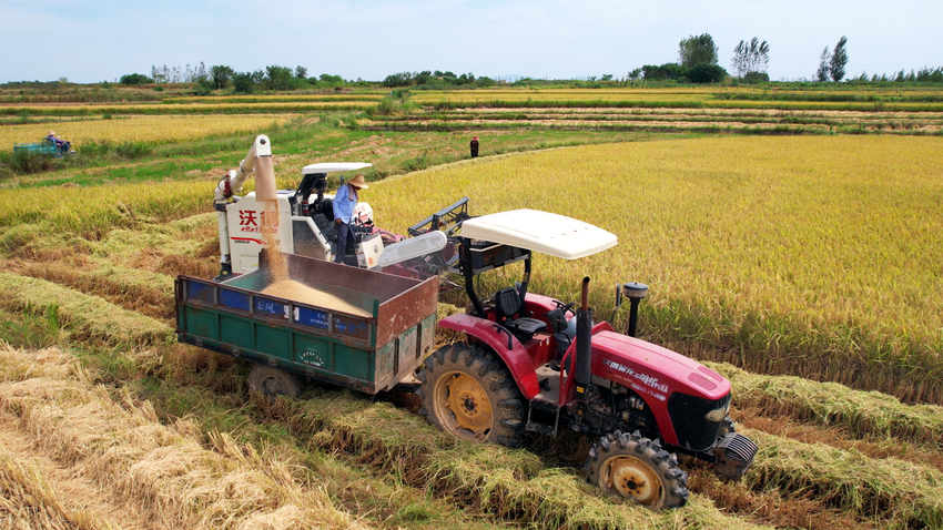 风吹稻谷黄,田间收割忙。在孝昌县白沙镇广袤的田野上6万余亩水稻陆续进入成熟期,沉甸甸的稻穗压弯了稻秆,微风拂过,金色稻浪层层涌动。田间地头,收割机轰鸣作响,农户们忙着收割、装运、晾晒,一派繁忙有序的丰收景象在秋日暖阳下铺展开来。
