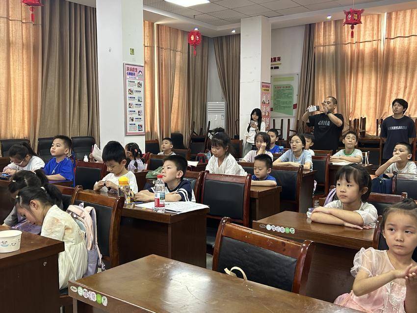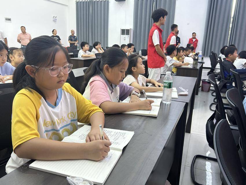 “千古江山,英雄无觅……”8月12日,在黄石市阳新县新港园区柏林村村委会会议室,50多名孩子全神贯注地朗读着南宋词人辛弃疾的《永遇乐·京口北固亭怀古》,稚嫩的童声抑扬顿挫,几名身着红马甲的志愿者穿梭其间,维持着现场秩序。
