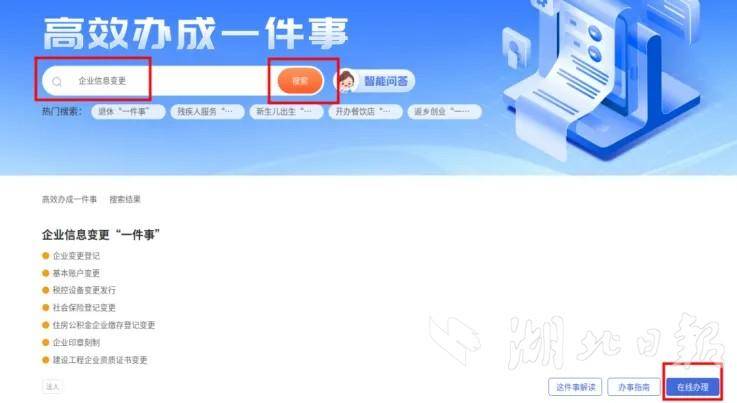 1、登录湖北政务服务网在高效办成一件事专区搜索企业信息变更“一件事”并点击在线办理;