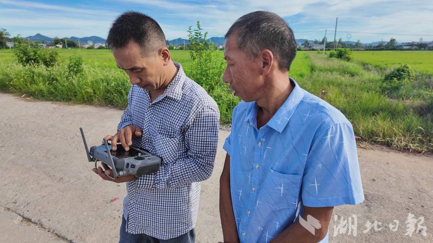 8月17日,崇阳县石城镇八一村的晚稻田里绿意盎然。农户魏伟秋操控着无人机掠过稻田,肥料均匀撒落在禾苗间。崇阳县科技特派员龚豪夫紧盯无人机作业轨迹,指导魏伟秋调整无人机高度、速度等参数。