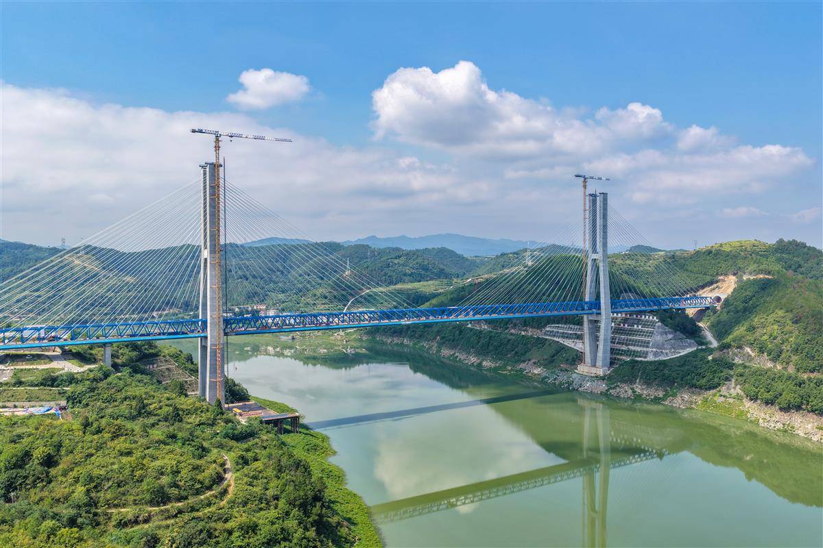 汉江特大桥位于十堰市,跨越丹江口水库库区,是世界最大跨度梁桁组合结构高铁斜拉桥,也是西十高铁全线控制性工程。该桥全长917.45米,设计主跨420米一跨飞跃汉江,P3、P4两座主塔高度均为186.5米。全桥共设置80对斜拉索,采用空间双索面体系扇形布置。
