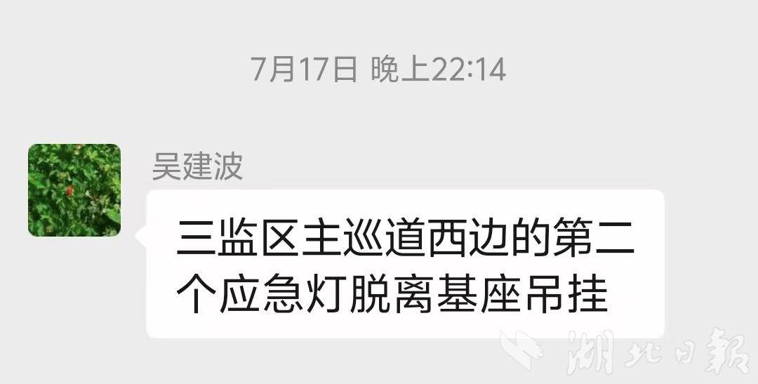 工作群里,吴建波的最后一条消息停在7月17日22时14分,还在提醒维修事项:“三监区主巡道西边的第二个应急灯脱离基座吊挂。”