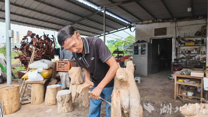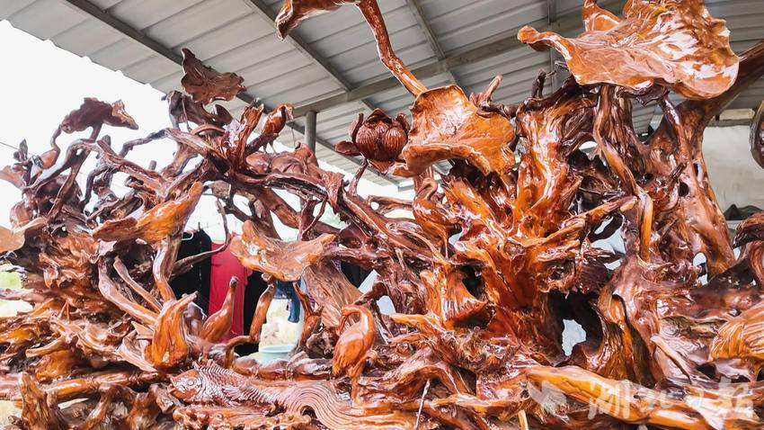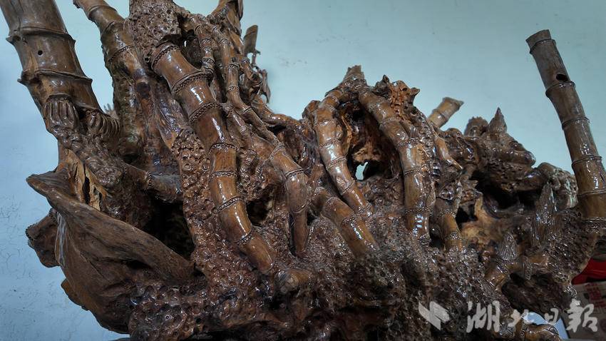 “这件作品是我五六年前做的一个大型根雕,名字叫作‘盛世清莲’,2022年在咸宁市工艺美术馆展出。”说起他的作品,刘明华打开了话匣子。“像这样一个根雕作品,从泥土清理到雕塑造型再到油漆、打磨抛光,我和徒弟一共创作了45天才完成。”