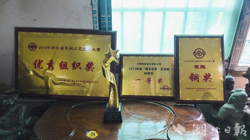 为了避免陷入“闭门造车”的困境,刘明华经常外出学习交流,参加各类雕刻比赛,看一看外面的“山外山,人外人”,2019年,在湖北省民间工艺技能大赛中,刘明华创作的根雕作品荣获铜奖。
