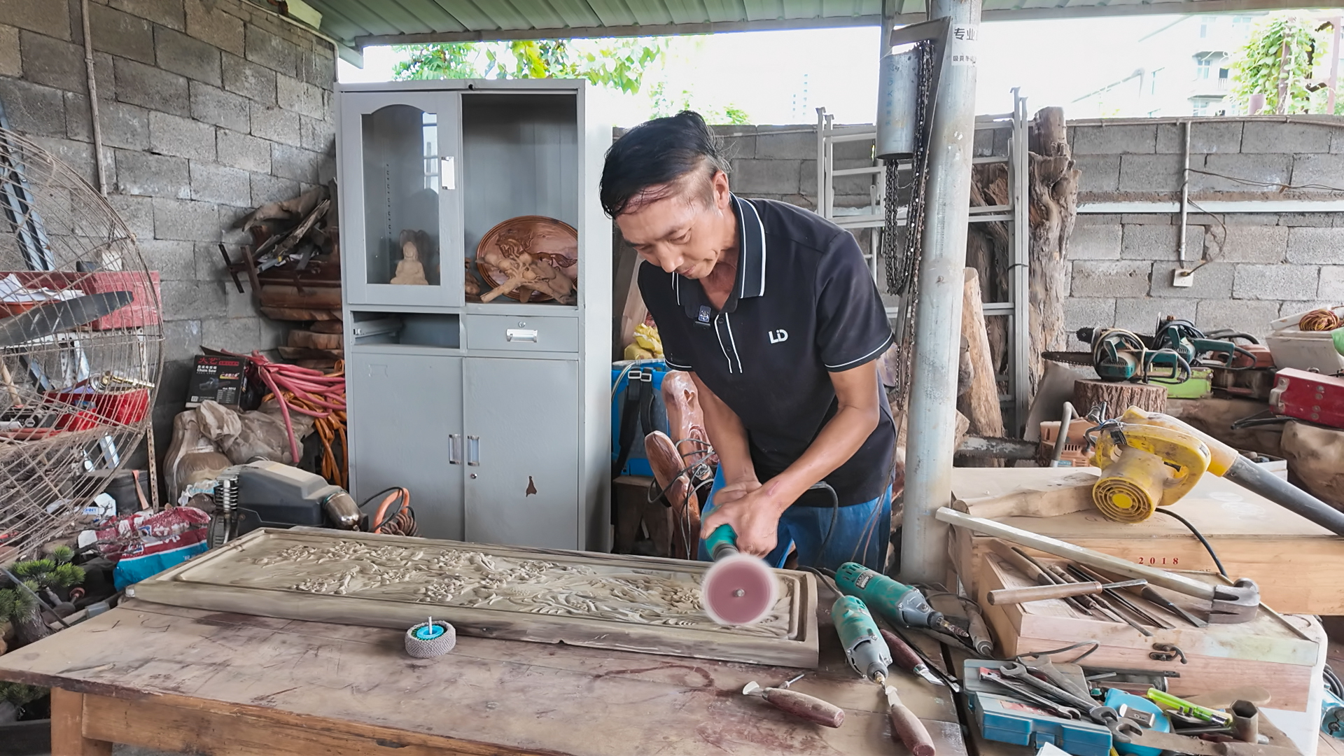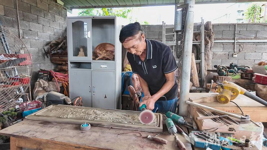 在刘明华的工作室里,放眼望去,凡是能放东西的地方都被他堆得满满当当,各种木雕原材料、工具。当天,他的工作是打磨已经雕刻完成的屏风,刘明华为它起名为“喜上梅梢”。