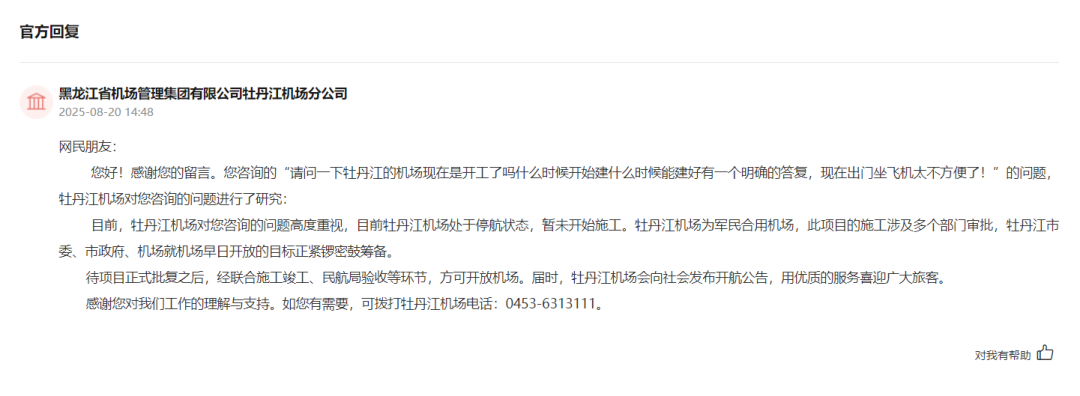 8月20日,牡丹江海浪国际机场官方就机场复航进展作出回应:目前机场仍处于停航状态,各项施工工作暂未启动,作为军民合用机场,施工需经过多个部门审批,待项目获得正式批复后,还需完成联合施工、竣工验收、行业验收等环节,方可具备复航条件。据悉,随着使用年限增长,牡丹江海浪国际机场的跑道道面破损问题持续加剧,已对航班起降安全构成潜在风险,今年3月30日起正式暂停所有航班运营。为加速推进复航进程,近日机场已发布《空军跑道翻建民航复航应急改造工程可行性研究报告竞争性磋商公告》,通过市场化方式遴选专业机构开展可研编制,旨在尽快明确跑道修复方案、解决道面破损核心问题,为民航业务的早日恢复奠定基础。