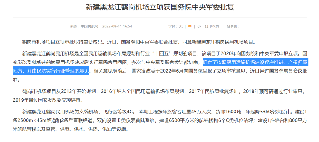2025年6月27日,鹤岗民用机场项目取得初步设计及概算批复,标志着项目前期筹备工作基本完成。近日,机场已陆续发布民航专业工程监理、飞行区场道工程施工等关键环节的招标公告,根据招标内容,鹤岗民用机场计划于2025年9月20日正式开工建设。(附图为“鹤岗军民合用机场”的辟谣)