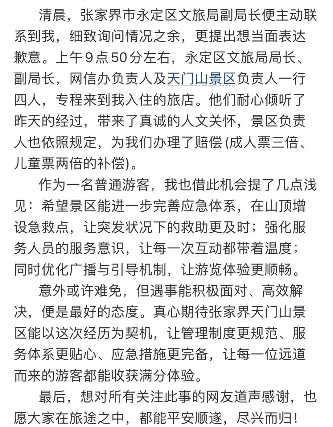 记者看到该名被困游客在社交平台发布了后续处理情况。游客表示,22日上午张家界永定区文旅局、网信办以及天门山景区负责人,专程到其入住的旅店,进行致歉、慰问,景区负责人也依照规定,为她和家人办理了成人票三倍、儿童票两倍的补偿。