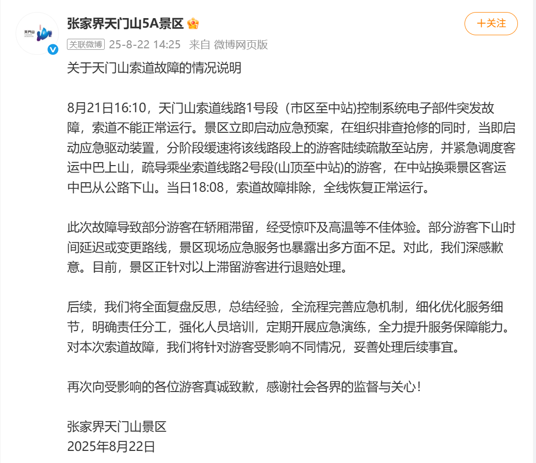 8月22日,张家界天门山景区发布情况说明称,8月21日16:10,天门山索道线路1号段(市区至中站)控制系统电子部件突发故障,索道不能正常运行。景区立即启动应急预案,在组织排查抢修的同时,当即启动应急驱动装置,紧急调度客运中巴将游客陆续疏散。当日18:08,索道故障排除,全线恢复正常运行。对此深感歉意。目前,景区正针对以上滞留游客进行退赔处理。