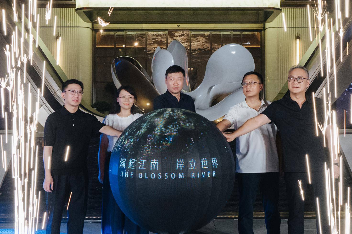 鎏金门序之外,长江奔流不息;门庭之内,嘉宾们汇聚一堂,欣赏音乐、品尝美酒,提前体验理想中的滨江生活场景。