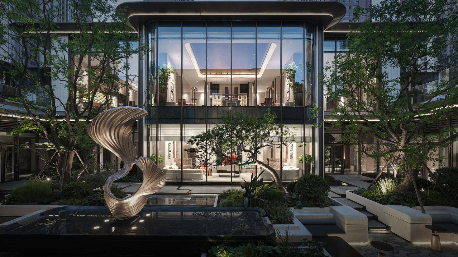 项目首创垂直滨水会所,打造芳疗、悦动、悦水、锦筵、奕趣、浮光素影等主题空间,将自在的滨江生活图景从想象变为现实;下沉式流水庭院,让人沉浸式体验了都市水岸生活的悠闲静谧;串联全区的风雨连廊,打破建筑与自然的界限,将绿意引入室内空间;童趣、阅读、健身、社交等主题架空层泛会所空间,为居住者带来多元化的社区生活体验。