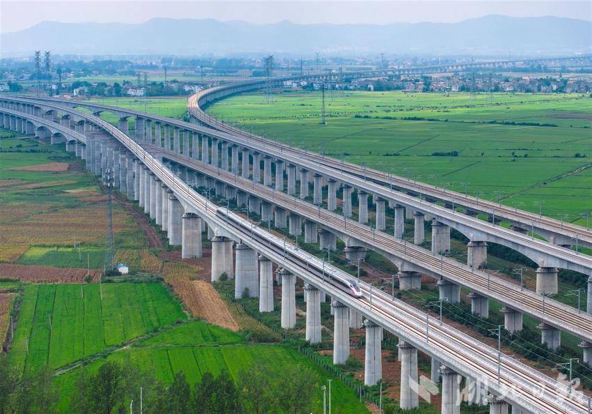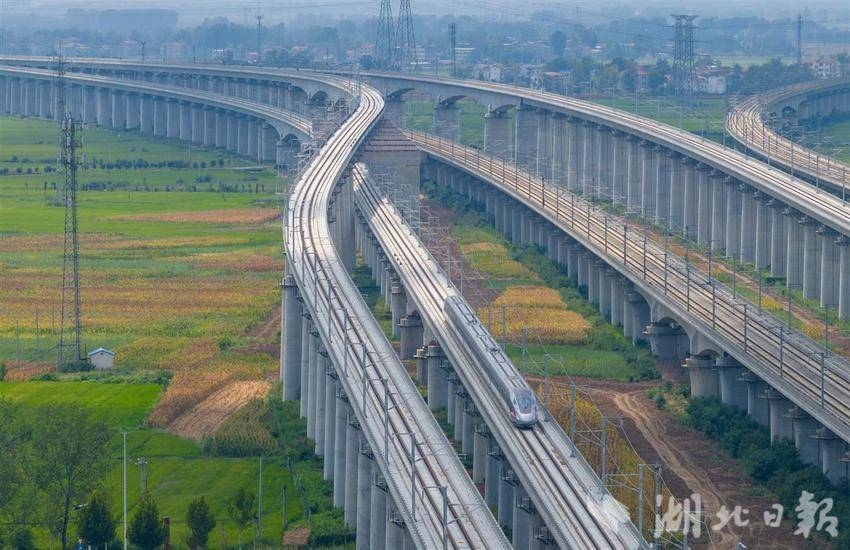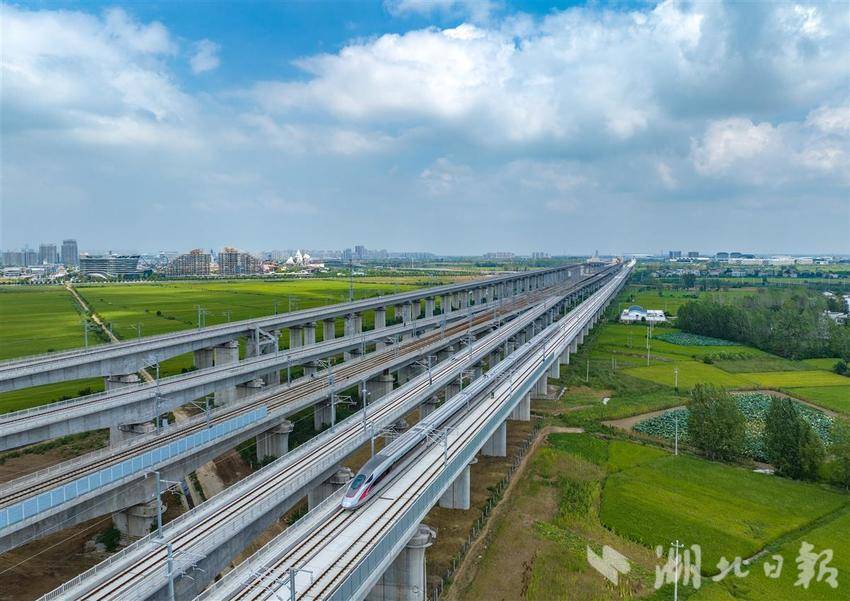 8月23日,襄荆高铁试运行列车行驶在襄阳市东津新区境内。当日,襄阳至荆门高速铁路展开运行试验,这标志着全线开通运营进入倒计时。襄荆高铁位于鄂西北地区,线路北起湖北省襄阳市、经宜城市、南至荆门市,设计时速为350公里,正线全长约116.23公里。建成通车后,旅客乘坐高铁从襄阳至荆门只需30分钟左右。作为我国“八纵八横”高铁网主通道之一“呼南通道”的重要组成部分,襄荆高铁北连郑渝高铁、南接沪渝蓉高铁,贯通起湖北省首条高铁大环线。(视界网 杨东 摄)