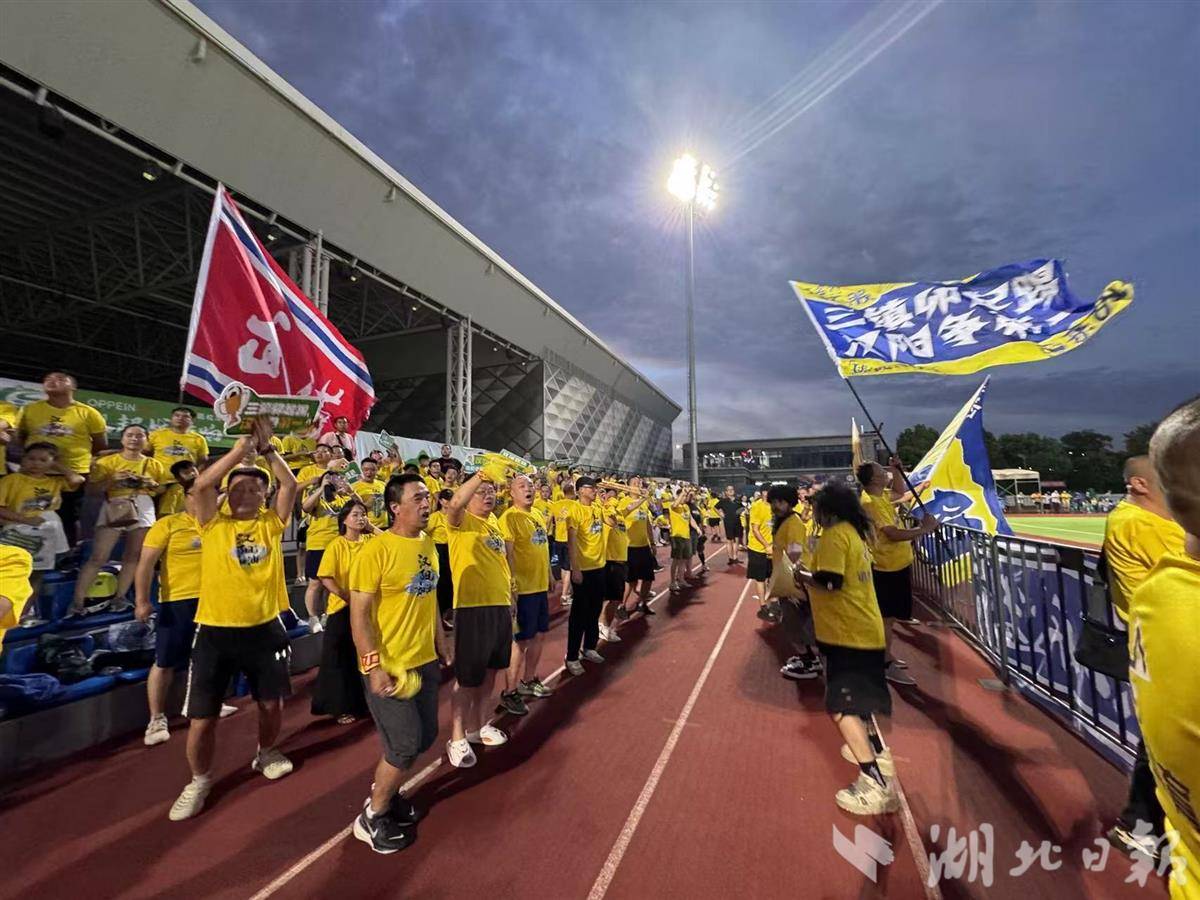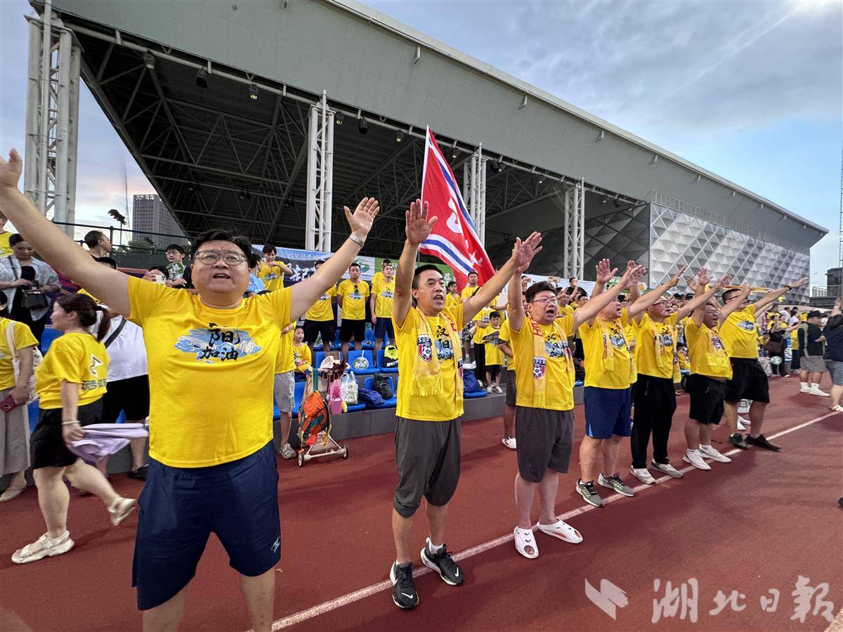 “汉阳队,进一球。”下半场一开局,统一身穿黄色上衣的汉阳球迷就坐不住了,齐声高喊、摇旗助威,为汉阳队加油。