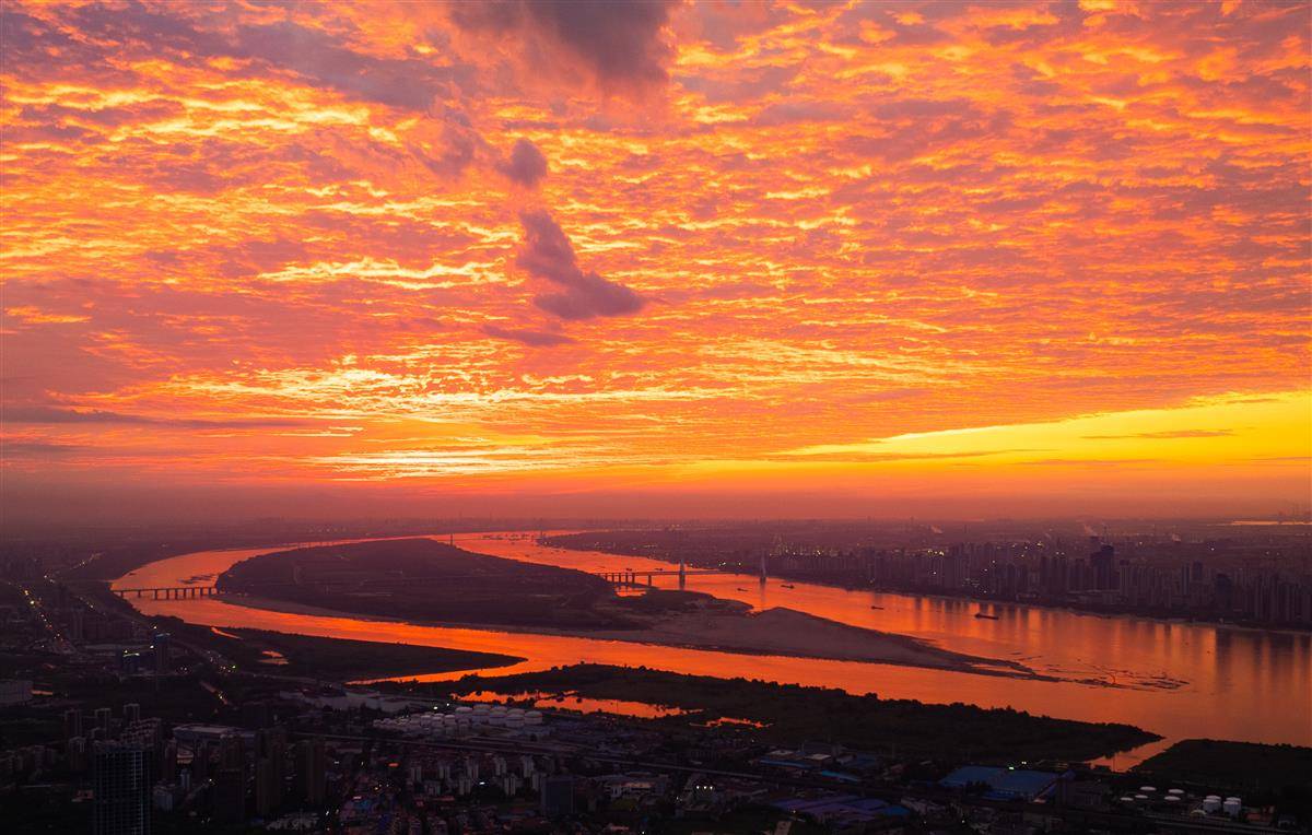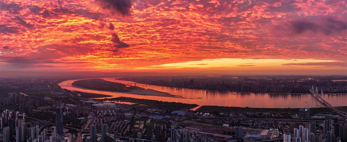 8月25日清晨,武汉上空上演绝美天象。从高空俯瞰,漫天红霞肆意铺展,将整座城市温柔笼罩。长江江面被霞光染成瑰丽的红色,波光粼粼间,船舶悠然行驶。城市在这漫天朝霞中渐渐苏醒,开启活力满满的一天。(湖北日报全媒记者 柯皓 摄)