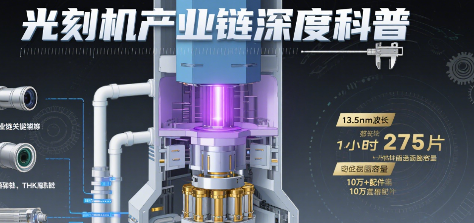 光刻机被誉为“人类工业文明的结晶”,一台高端EUV光刻机包含超10万个精密零件,需要集结德国蔡司的镜头、美国Cymer的光源、瑞典的精密轴承等全球顶级技术。其精度相当于“用飞机喷气口在米粒上刻出整部《红楼梦》”。