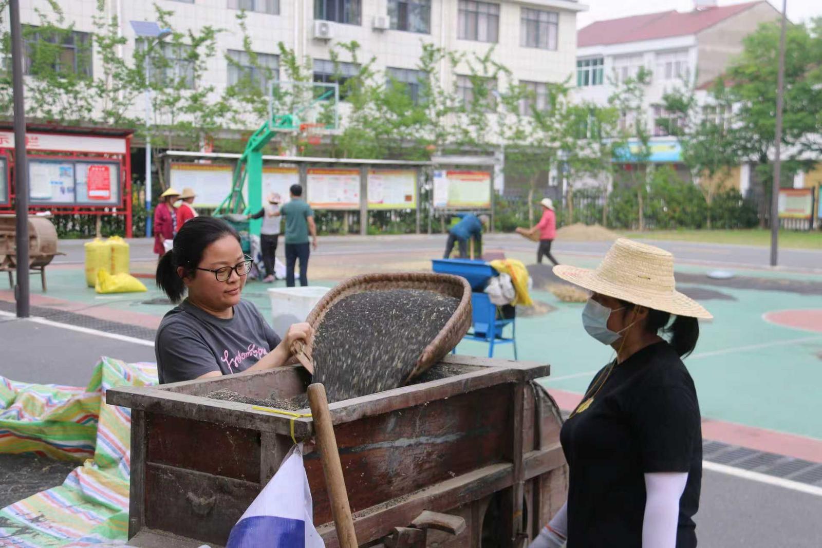 洋坪镇“进农村、学支书”实践活动中年轻干部与村民一同对晾晒后的油菜籽去除杂质