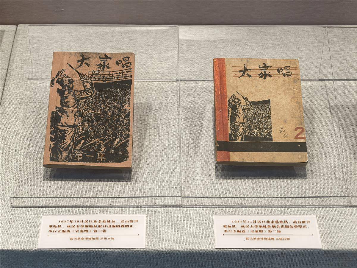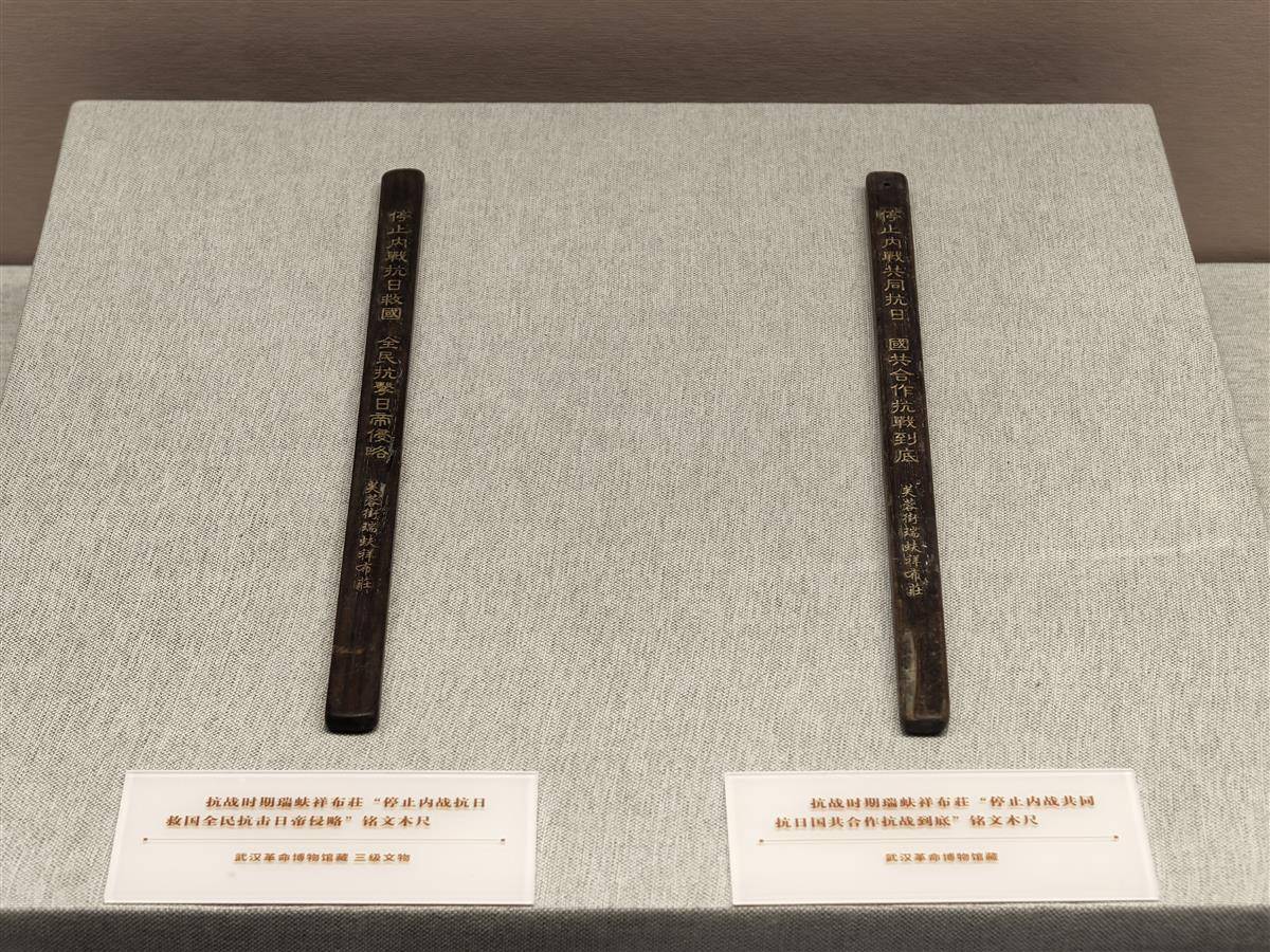 展览以物证史,依托武汉革命博物馆丰富的馆藏资源,精选湖北省内各个地区具有代表性的抗战文物80余件/套,展出历史图片约300张,见人见物见精神。参与策展的该馆编研部负责人刘宇洁指着展柜内一件件珍贵文物说,“抗战时期瑞蚨祥布荘‘停止内战抗日救国全民抗击日帝侵略’铭文木尺,反映了群众对中国共产党团结抗战主张的认同。”“1937年在汉出版的《大家唱》,展示了各地文艺精英齐聚武汉,以救亡音乐唤起民众抗战救国的信心。”“抗战时期新四军第五师兵工厂自制‘十子连’手枪、李先念使用过的毛毯(1943年缴获日军)等文物,见证了在中国共产党领导下新四军第五师浴血奋战的历史。”