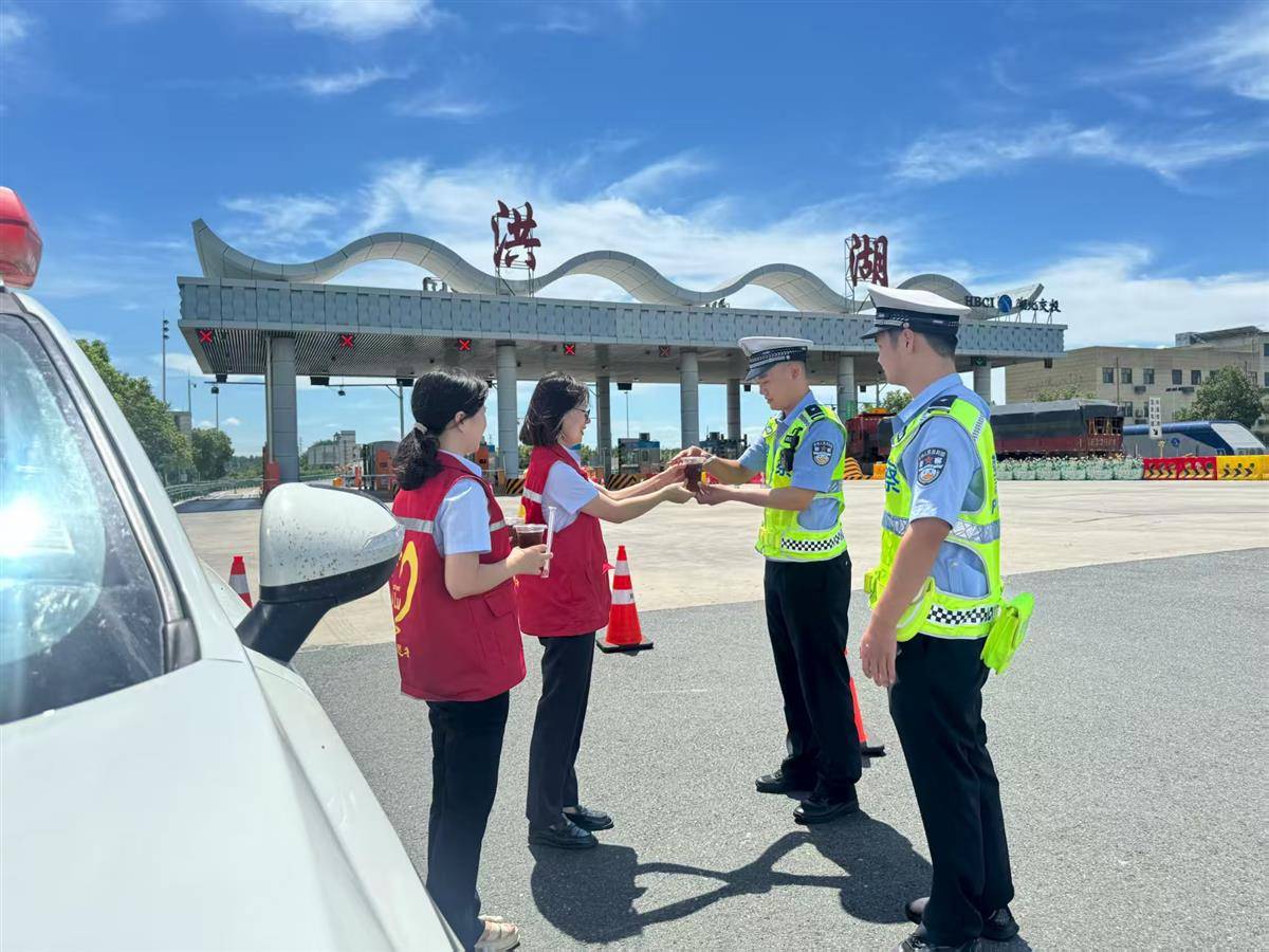 在川流不息的收费站现场,志愿者们早已备好冰镇矿泉水、西瓜、绿豆汤及防暑药品,并主动为过往司乘递上清凉物资,声声“师傅,天气热,多喝水,注意安全”的叮嘱,伴随清凉一起沁入心田。在荆岳大桥上,养护工人们从巡检办工作人员手中接过一碗碗冰镇绿豆汤,清甜滋味不仅消解了暑气,更带来发自心底的欣慰。而对于正坚守岗位执勤的高警与路政人员,志愿者们为其送上自制酸梅汤,用一份酸甜清凉传递深深的敬意与社会的温情。