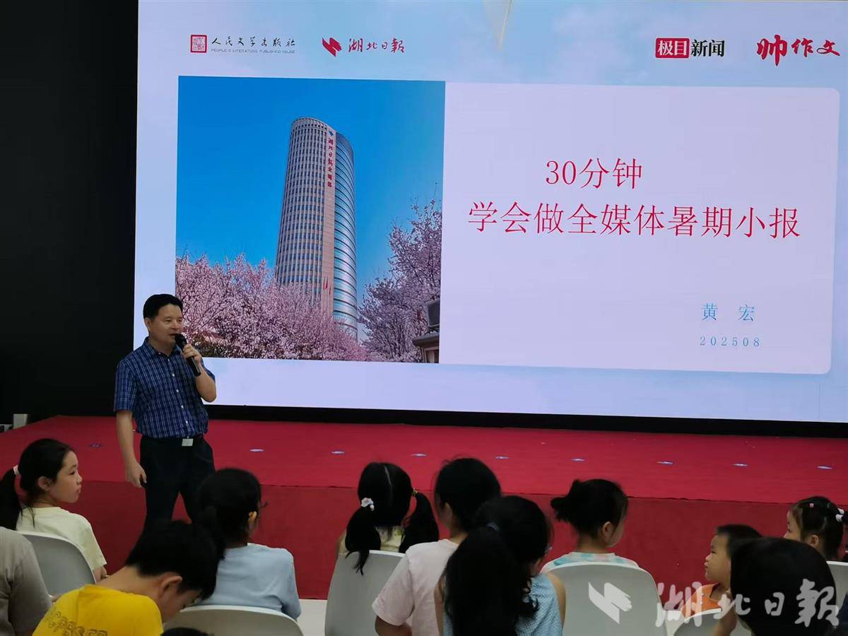 高级记者、《帅作文》执行主编黄宏则从“新闻”概念讲起,结合自身多年媒体工作经验,用一组鲜活的照片和版面实例向孩子们讲授“学会做全媒体暑期小报”的方法要点。