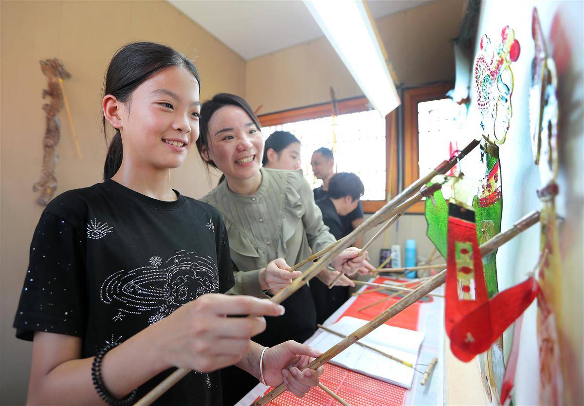 “彩虹行动”爱心托管班的孩子学习皮影演技,近距离感受非遗魅力。