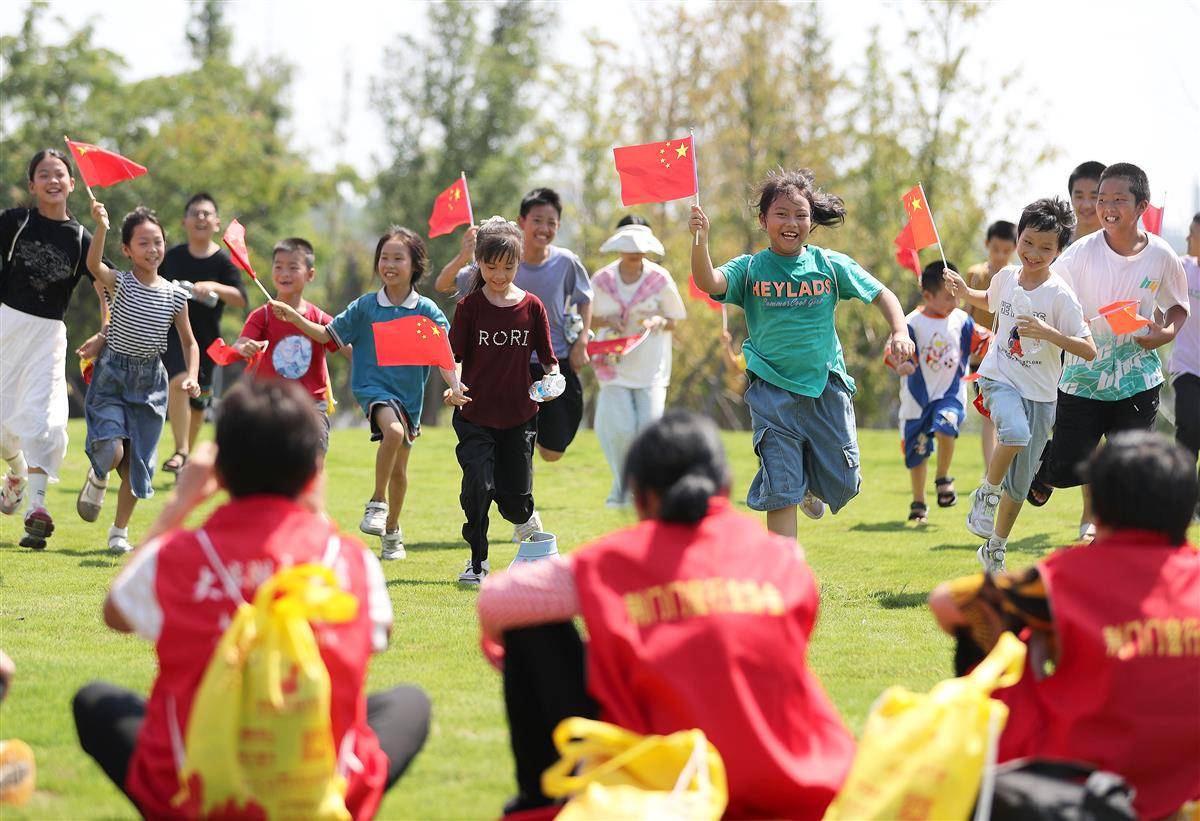 乡村“彩虹行动”爱心托管班的孩子们在园博园开展趣味游戏。