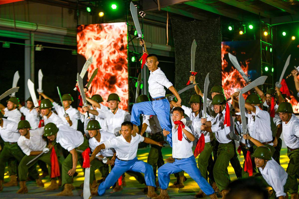 随后,情景朗诵表演《抗日英雄》徐徐展开。官兵们化身杨靖宇、赵尚志、左权等抗日英烈,用生动的演绎再现了那些惊心动魄的战斗瞬间,每一个场景都让官兵们热血沸腾。“大刀向鬼子们的头上砍去!全国爱国的同胞们,抗战的一天来到了……”表演唱《大刀进行曲》铿锵有力的节奏、振奋人心的歌词,配合着官兵们整齐划一的刺杀动作,生动再现了当年中国军民手持大刀奋勇杀敌的壮烈场景。