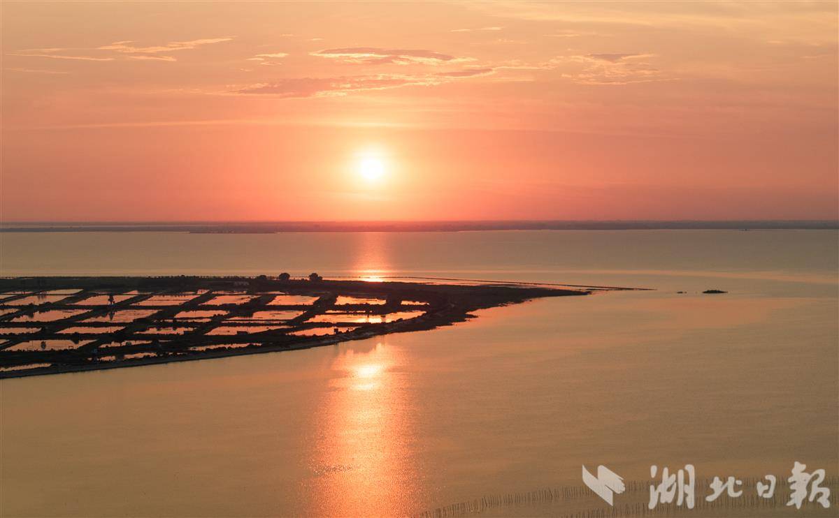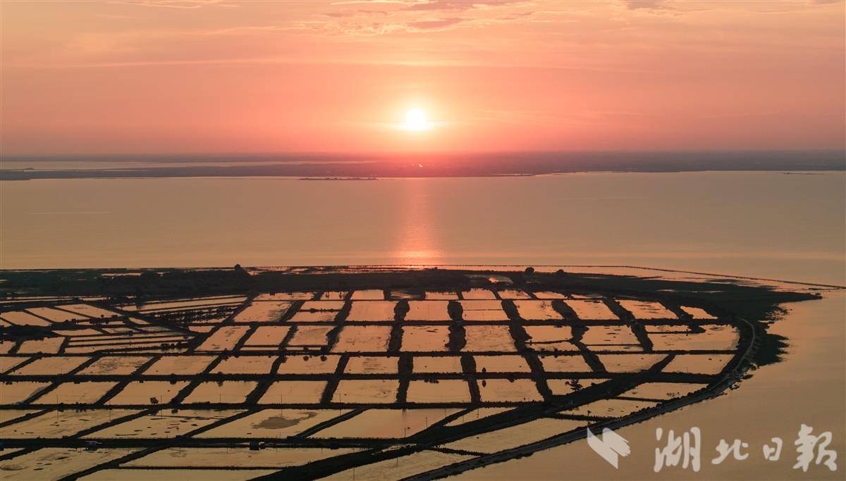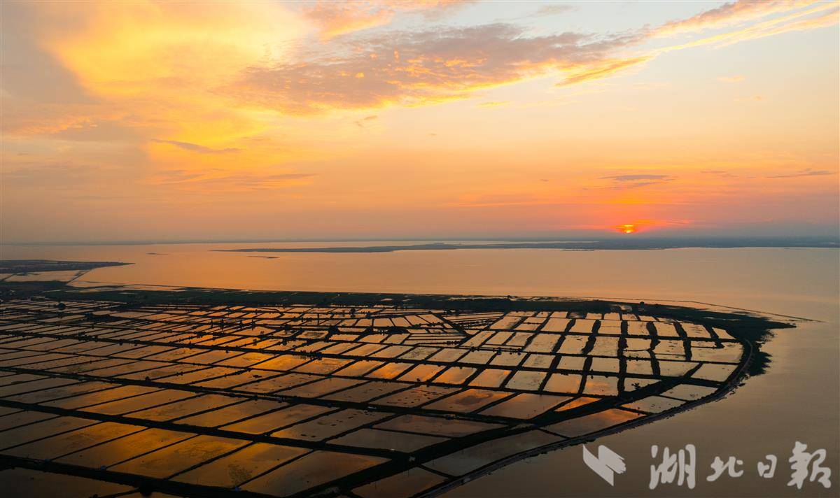 8月27日 ,洪湖迎来绝美落日晚霞。航拍视角下,水乡特色田块如明镜,倒映落日余晖与天际云霞,勾勒出一幅美丽的生态画卷,尽显水乡独特魅力 。(湖北日报全媒记者 薛婷 摄)