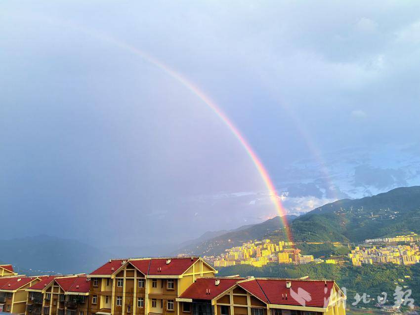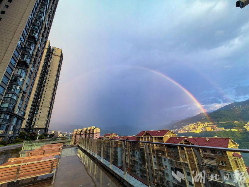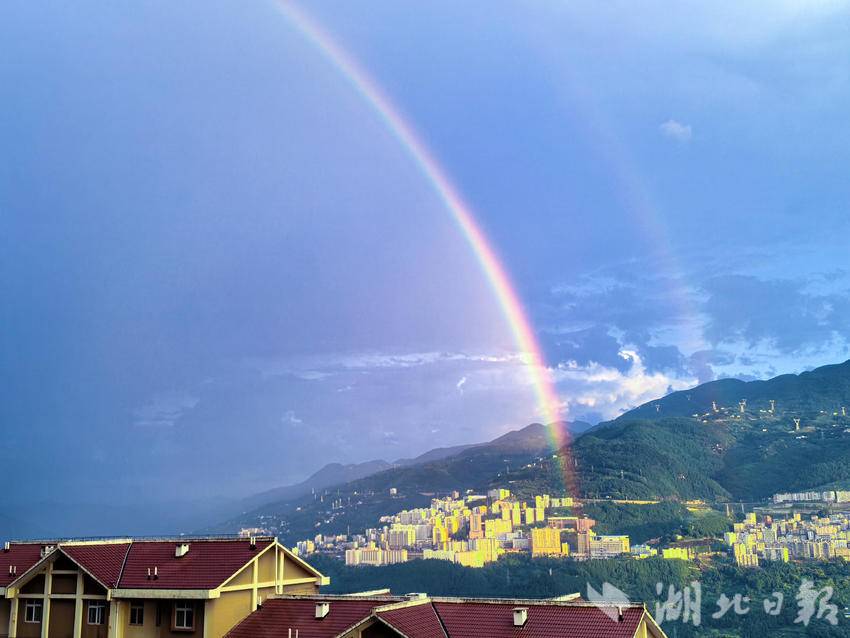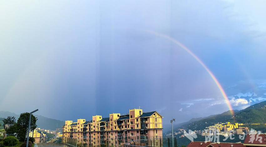 湖北日报客户端讯(通讯员陈功龙)8月27日傍晚,一场短暂的降雨过后,湖北巴东县城上空惊现一道绚丽的彩虹,为雨后的山城增添了一抹动人的色彩,引得众多市民驻足观赏、拍照留念。