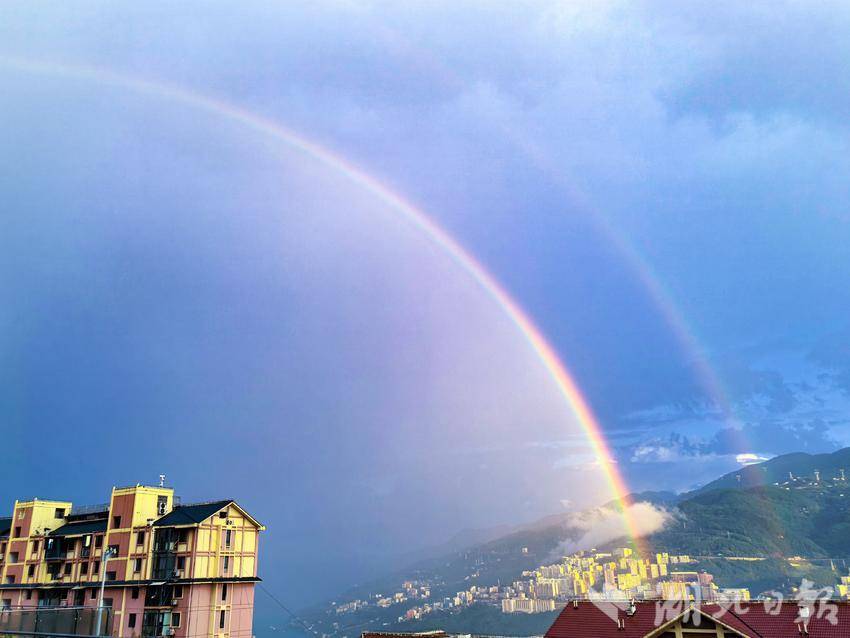 这道彩虹色彩极为饱满鲜艳,从外至内,赤、橙、黄、绿、青、蓝、紫七色层次清晰可辨,在尚未完全散去的深灰色云朵和湛蓝色天空的背景映衬下,显得格外耀眼夺目。彩虹的一端仿佛垂落在远方的山脊之上,另一端则延伸至城市上空,构成了一幅浑然天成的壮丽图景,持续时间长达十五分钟左右。