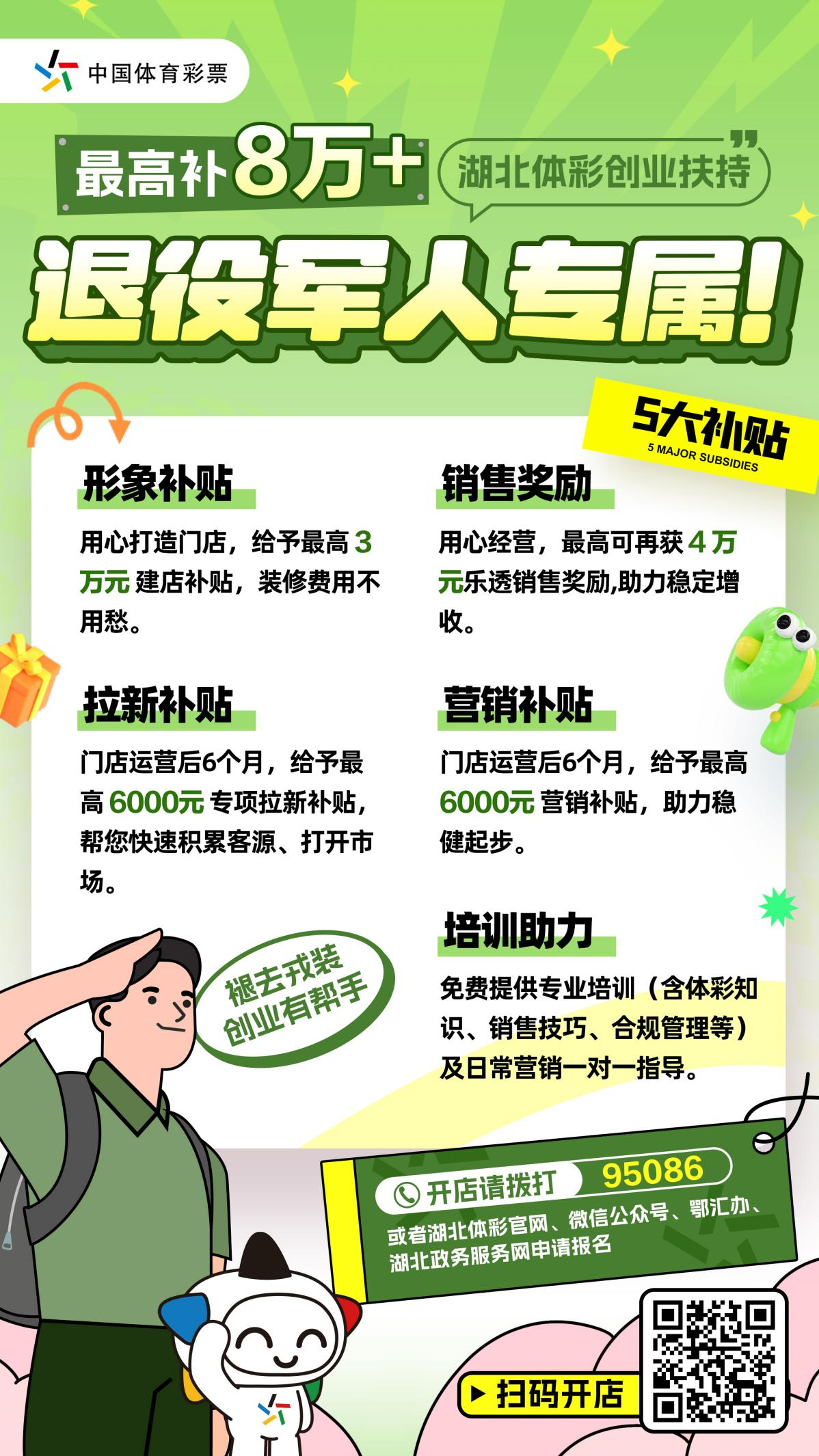 褪去戎装,创业有帮手!湖北体彩面向退役军人开展首期专项扶持计划,诚邀100名退役军人加入体彩公益事业,开店最高补贴8万 ,实打实地为你的创业梦添柴加火,彰显社会责任,更盼与你并肩前行!具体事项如下: