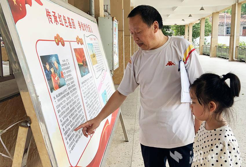 8月26日,丹江口市小学一年级新生报名的日子,丹江口市徐家沟小学“传承红色基因,争做时代新人”革命传统教育展板前,一位老者指着展板上的文字和插画,逐字逐句地讲述电影《闪闪的红星》潘冬子革命成长的故事。