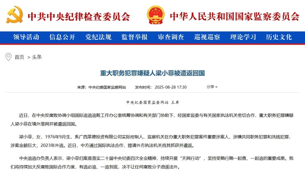 近日,在中央反腐败协调小组国际追逃追赃工作办公室统筹协调和有关部门协助下,经国家监委与有关国家执法机关密切合作,重大职务犯罪嫌疑人梁小菲在境外落网并被遣返回国。