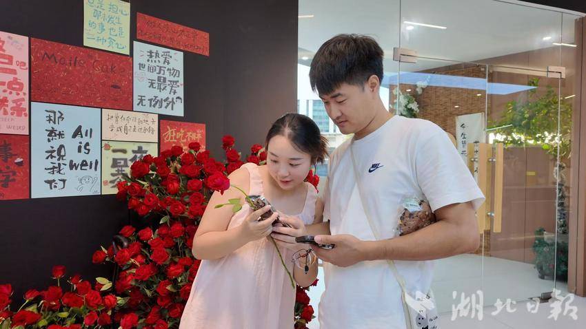 为了营造甜蜜、浪漫的节日氛围,该蛋糕店还准备了线下互动活动。七夕当天,店内设置情侣打卡墙,每位进店顾客可以凭小票领取一支玫瑰花,传递节日的浪漫心意。