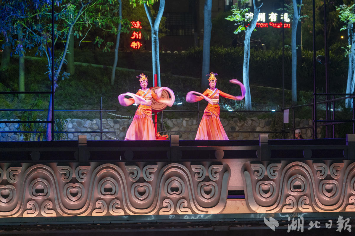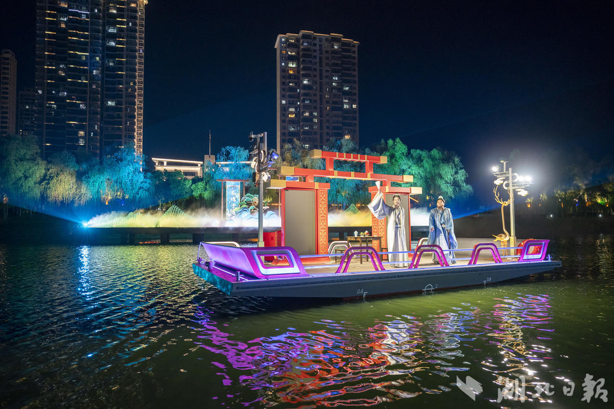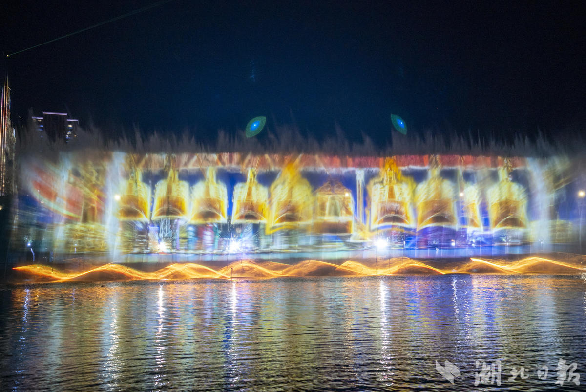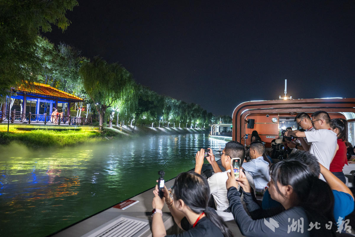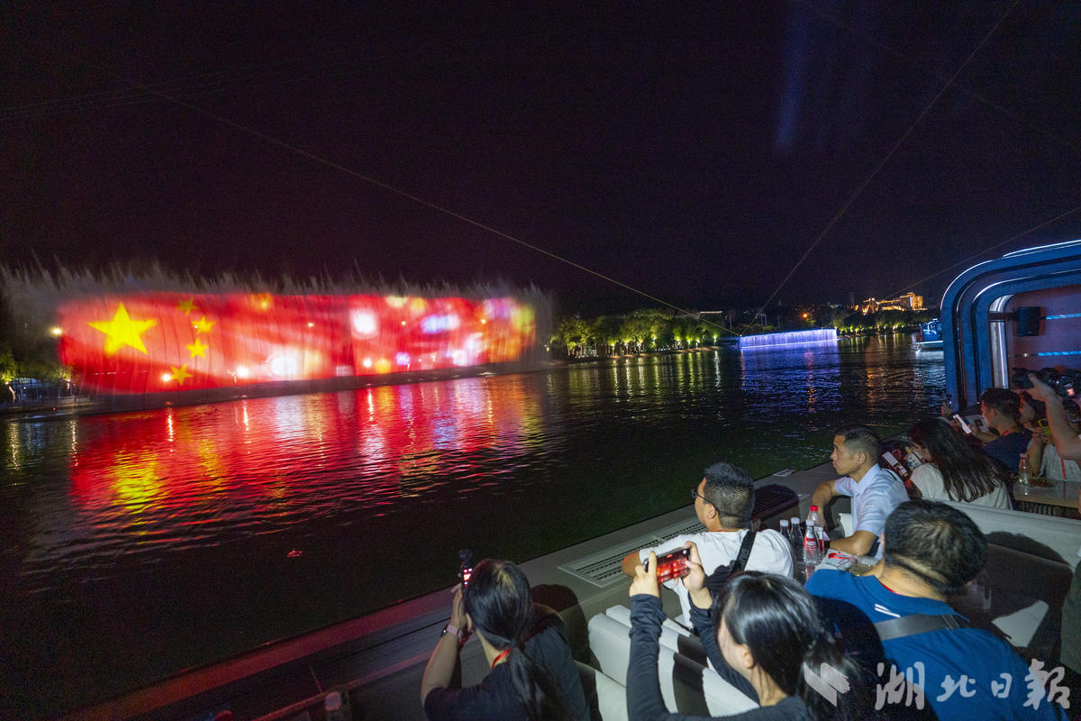 8月28日晚,随州首个城市水上夜游项目——云湖夜澜夜游正式启航。当晚,随州白云湖两岸灯光璀璨,首批游客们登上游船,沉浸式体验古与今、文化与科技的交融。流淌出“年轻、文化、科技、时尚”随州的更多可能。据介绍,此夜游项目以游船为移动舞台,8公里不断变幻的水岸风景,融合了3D水幕投影、湖面光影舞蹈、桥体激光矩阵与真人表演,10余处实景节点,时长约60分钟,让游客在看风景中读懂随州历史,感受新时代随州的变迁。(湖北日报全媒记者 魏铼 摄)