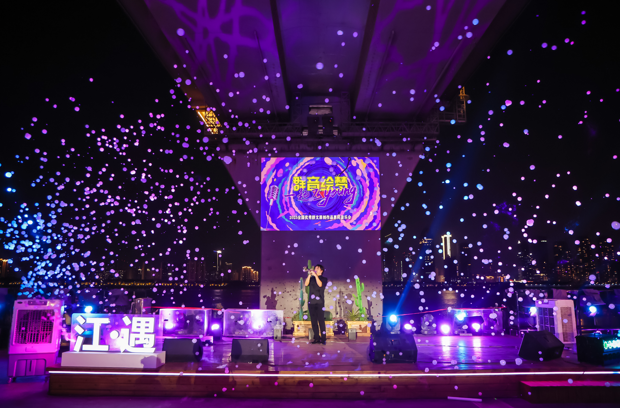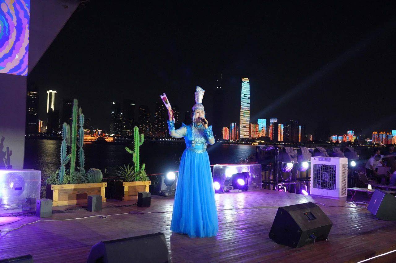 夜幕下的汉口江滩,长江二桥灯光与露天舞台交相辉映,晚风里的原创旋律中,千余名观众举着荧光棒随节奏挥动,星星点点汇成“荧光海”。8月27日晚,“群音绘梦 一起飞Young”2025全国优秀群文原创作品惠民音乐会在武汉江遇桥墩电影营地温情开演,12首来自全国的优秀群文原创作品轮番登场,这些音乐创作者来自20多个省,从江南水乡情到草原辽阔意,从城市烟火气到故乡思念情,这场看得见江风、听得见民心、触得到温暖的多民族音乐盛宴,让市民在家门口就享受到全国优质群文成果。“我们就是想让群文艺术走出剧场、走进生活,让更多人都能轻松享受优质文化成果。”湖北省群众艺术馆相关负责人表示。