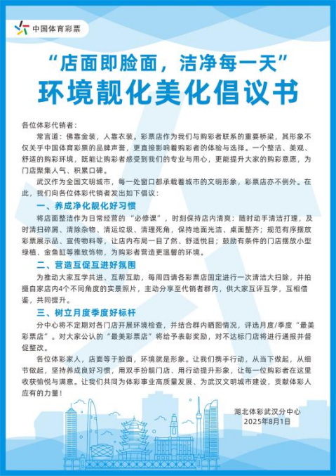 2025年8月1日,湖北体彩武汉分中心向全市体彩代销者下发《环境靓化美化倡议书》,倡导以“店面即脸面,洁净每一天”为主题,全面提升体彩销售场所环境品质。一个月以来,该倡议得到广泛响应,武汉市体彩店面貌显著改善和升级,掀起一股靓化风尚。