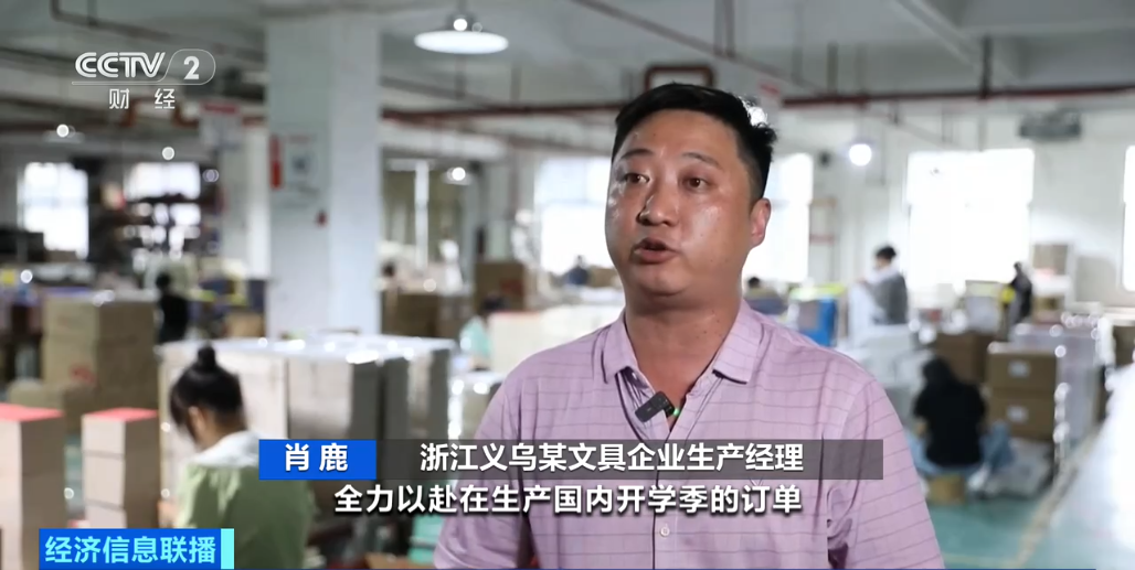浙江义乌某文具企业生产经理 肖鹿:全力以赴在生产国内开学季的订单。外贸订单业务已经对接到10月份以后,公司全力以赴赶制欧美订单和东南亚订单。
