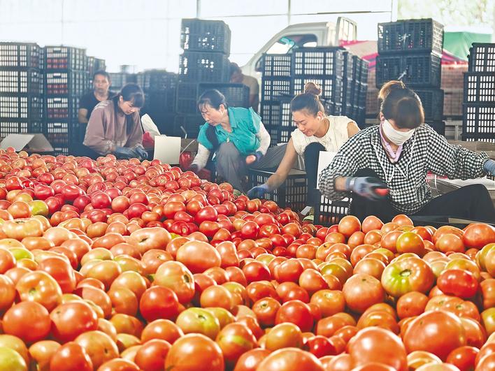 来自云南的女工对长阳高山番茄进行分拣包装。