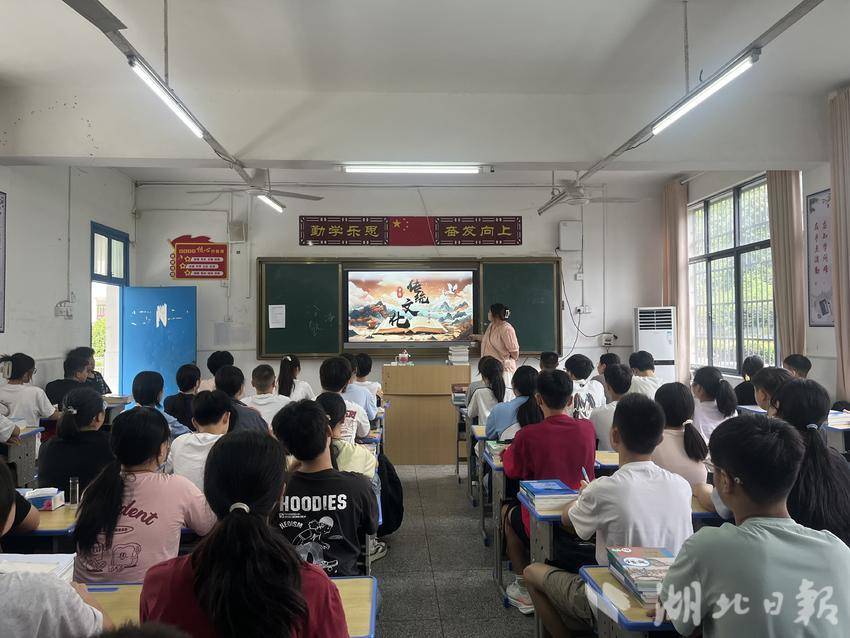 崇阳县天城中学904班的课堂,飘着浓浓的“文化香”。老师以“中华传统文化”为核心,从春节的团圆饭、端午的龙舟赛等,讲到剪纸、皮影等非物质文化遗产,还播放了精心准备的古风视频——画面里的汉服、古建、传统技艺,让同学们仿佛“穿越”回古代。互动环节中,大家争相分享自己了解的传统故事,有奶奶教的包饺子技巧,有讲老家的中秋习俗,课堂氛围热烈又温馨。
