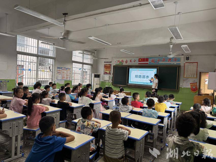 在崇阳县第六小学,“开学第一课”充满了严肃与专注。9个班级同步开展“爱国主义教育+预防溺水”双主题课堂,屏幕上播放着国旗护卫队的视频、溺水警示案例,同学们挺直脊背,目光紧紧追随着画面里的每一个瞬间。有人悄悄在笔记本上写下“我爱中国”,有人把“防溺水六不准”逐条划重点,把爱国主义精神和防溺水知识深深刻在脑海中。