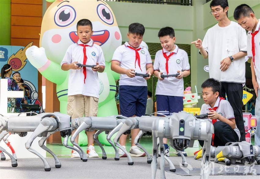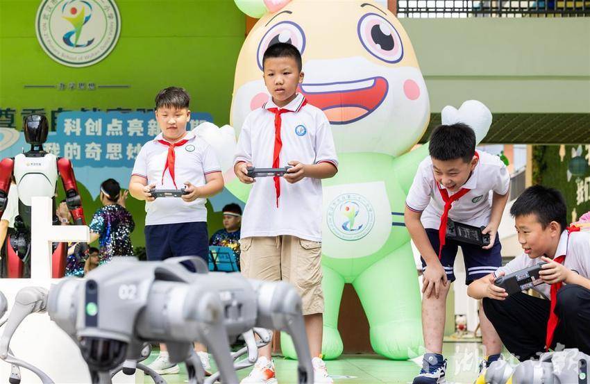 9月1日,武汉市光谷第二十一小学,同学们操作机器狗进行表演。