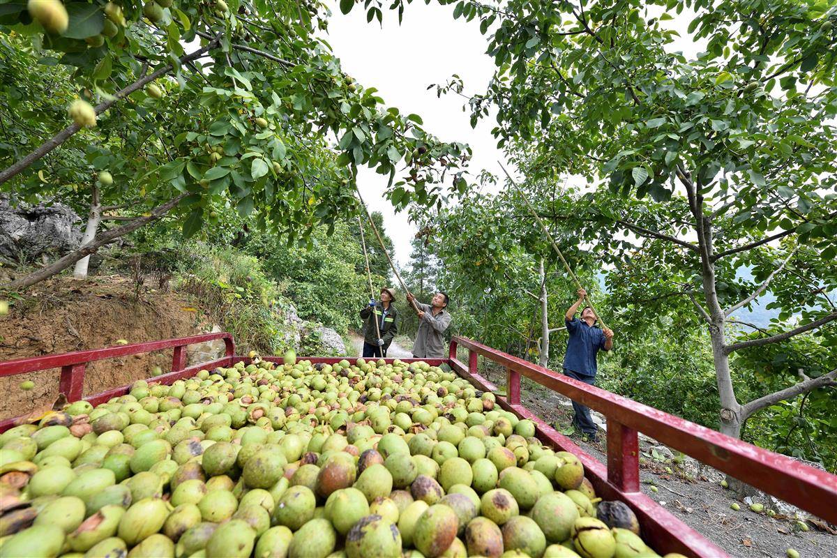 金秋时节,保康县35万亩核桃林挂满果实,林间,农民挥杆采收,青果落地的簌簌声与欢声笑语交织。