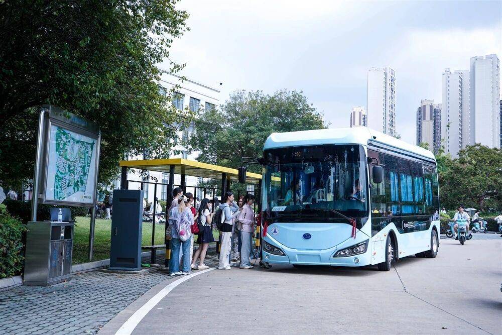 2025年9月1日,为解决新学期学生们的校内通勤问题,中南财经政法大学联合武汉公交把超萌 “宝宝巴士” 开进南湖校区,“波泰高速”线、临湖线、校内大环线、中区早高峰线4条巴士线路串联起校园各个角落。据了解,这次入驻的 “宝宝巴士” 车身相较之前的校车全面加长,车厢宽敞稳当,堪称 “移动的校园观景台”,学生乘车不用办卡、不用下载 APP,使用微信或支付宝扫码就能便捷支付,一元就能畅游学校。此外,9月6日新生报道当天,在南湖校区西北门和北门两个入校口都会各有一辆巴士免费待命服务新生,也让即将到来的新同学们以舒适的身心踏入大学时光新征程。(湖北日报全媒记者 何宇欣 通讯员 卓张鹏 实习生 陶晨曦 摄)