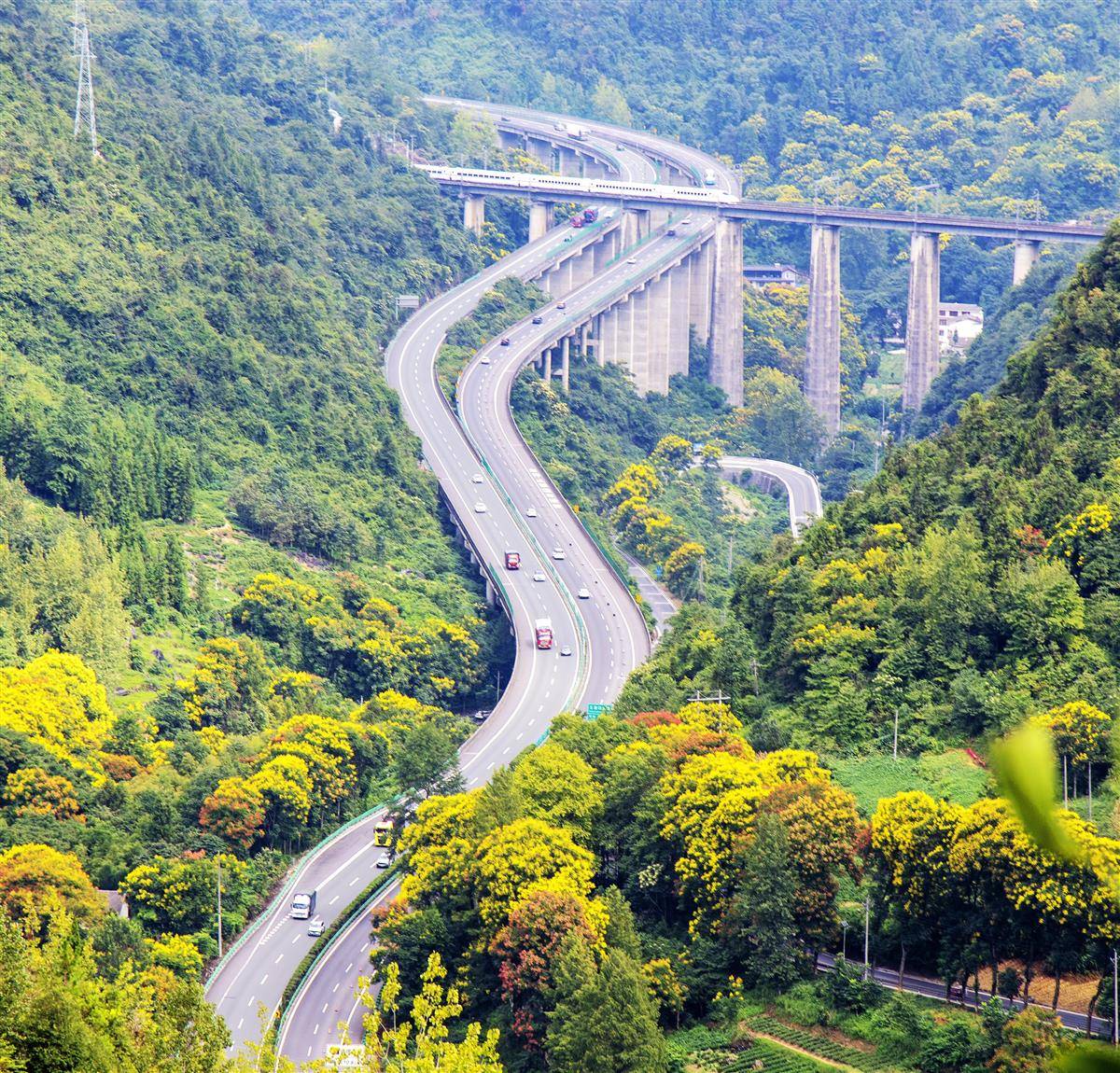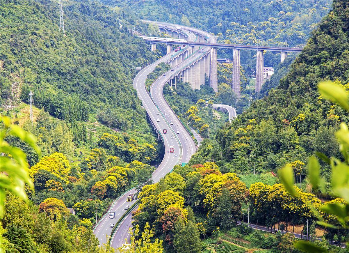 8月31日,恩施市白果乡境内,沪渝高速、乡村公路、宜万铁路、山峦、栾树花、民居等相映成景,绘就一幅初秋武陵山区美丽的画卷。