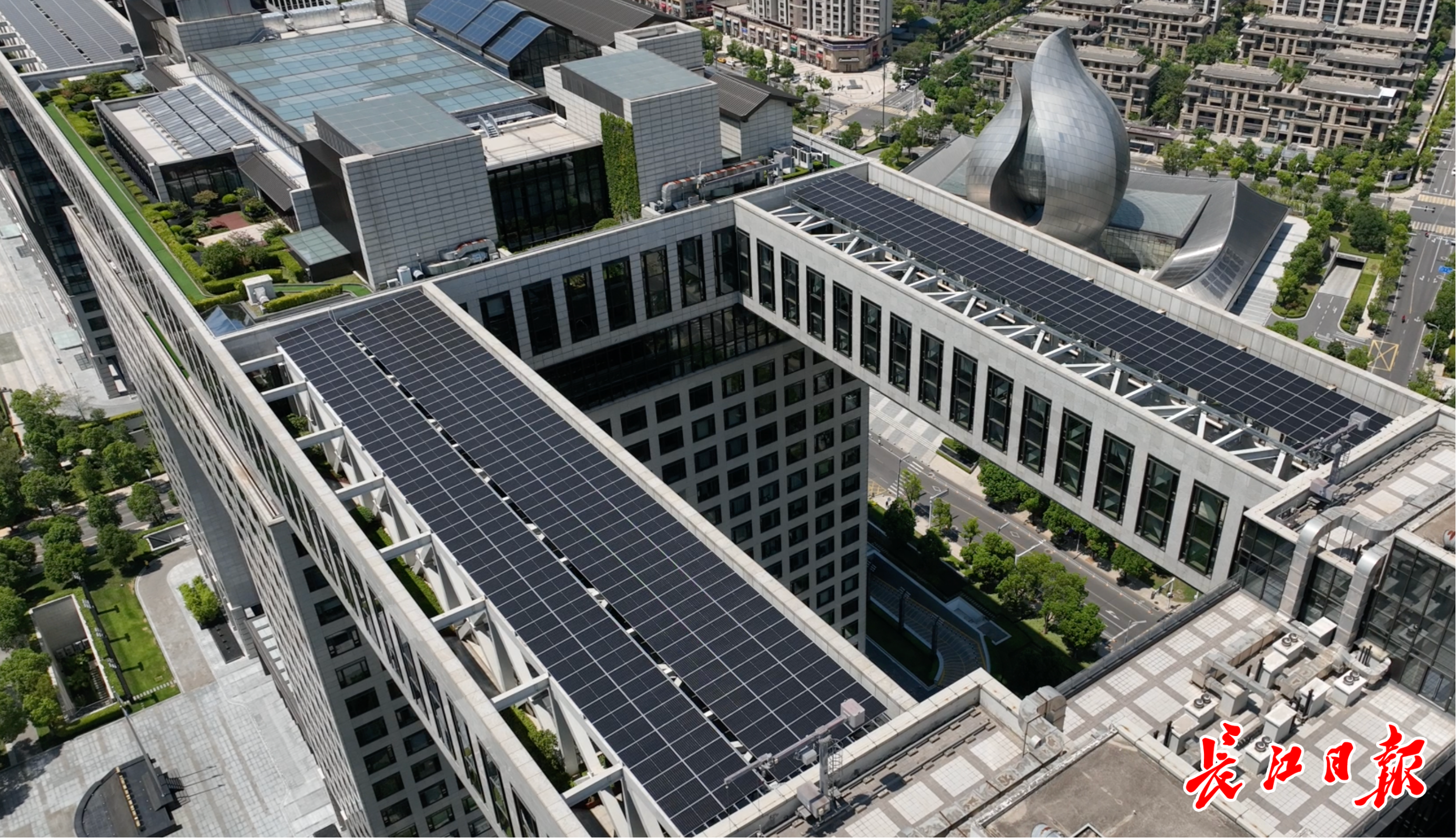 高空俯瞰,中建三局办公楼楼顶、连廊上,1.4万平方米单晶硅光伏板在阳光下熠熠生辉。阳光充足时,它们每小时可产生2000度电,平均每年可发“绿电”200万度。