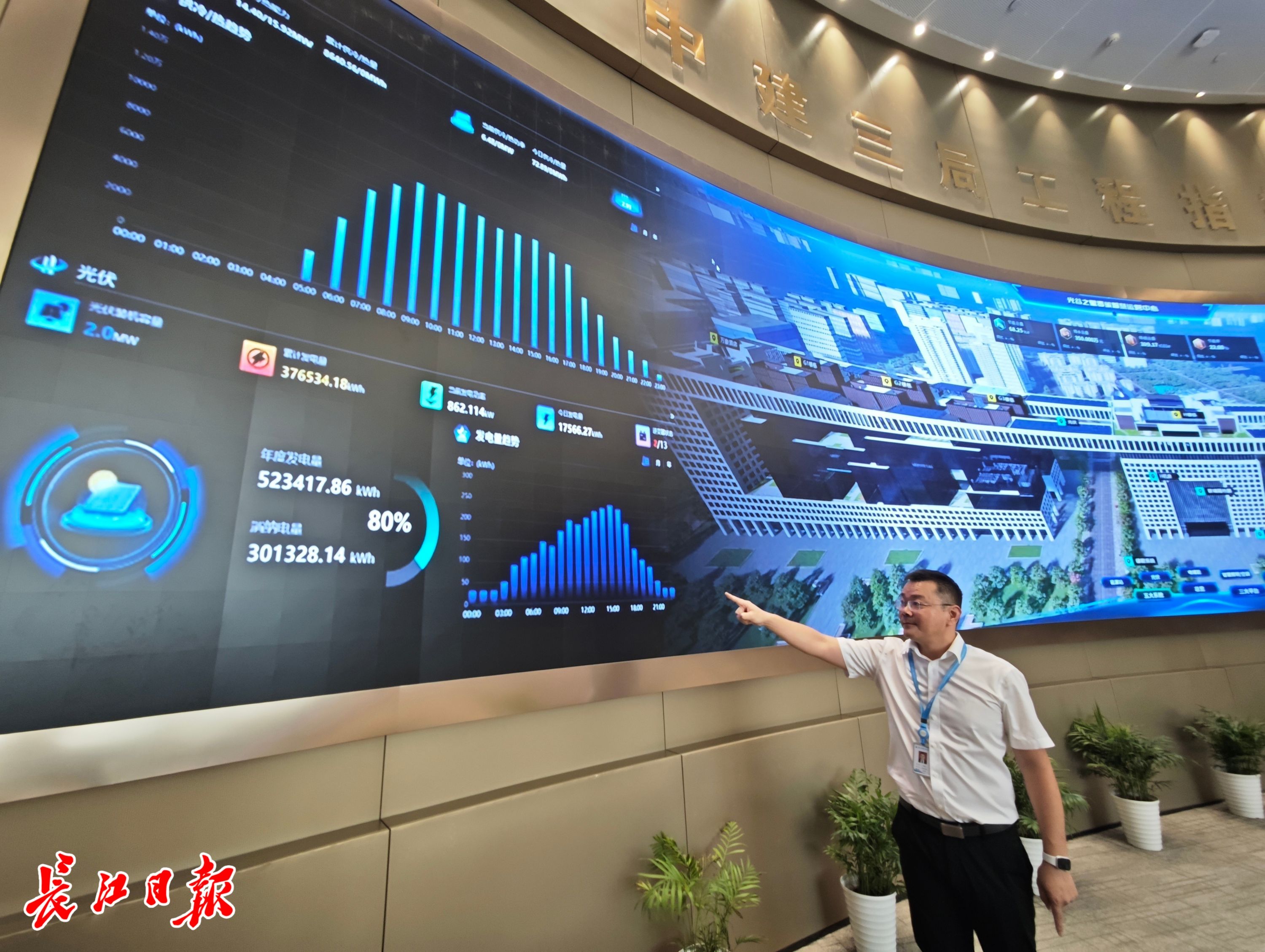 连日晴热,炽热阳光下,位于东湖高新区高新大道旁的中建三局总部办公楼内部凉爽宜人。然而此时,大楼空调用电却并非取自电网,而来自光伏发出的绿色电能。