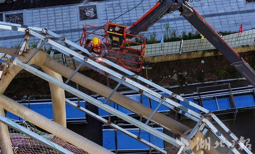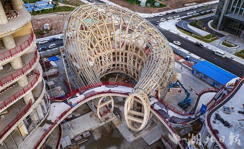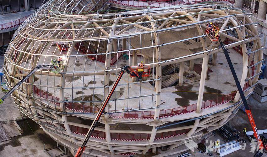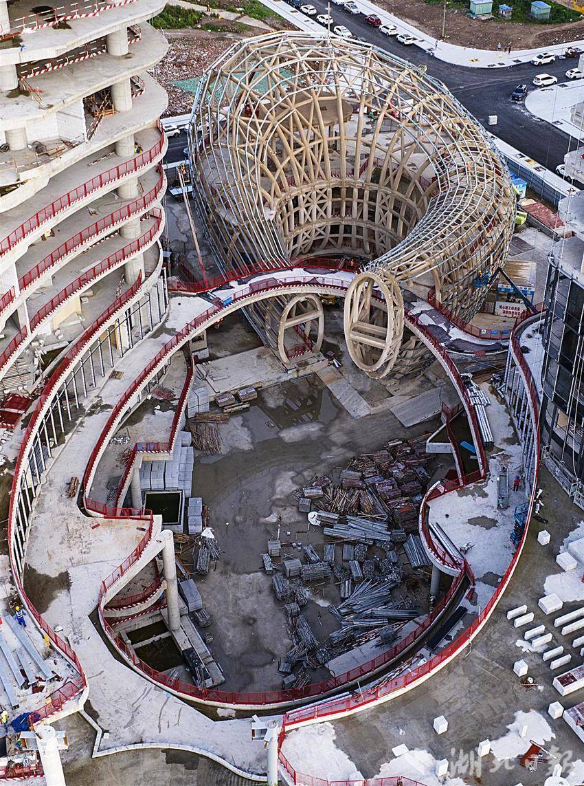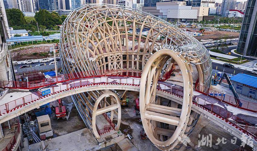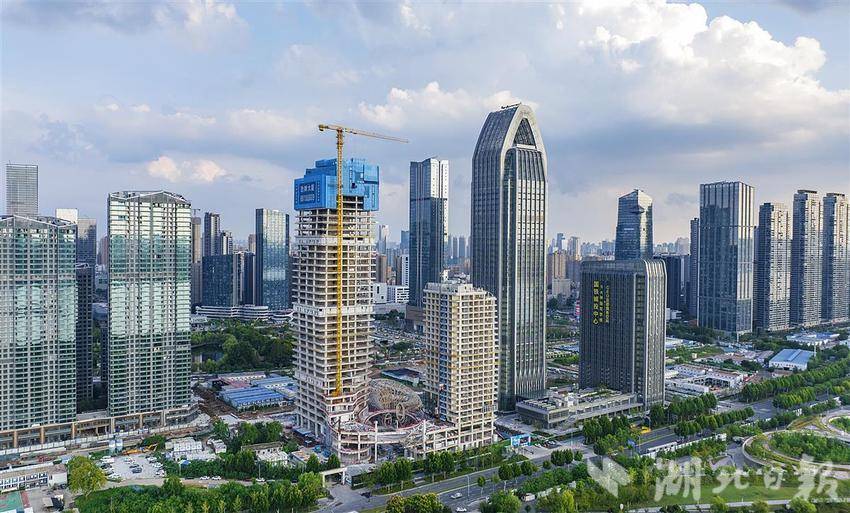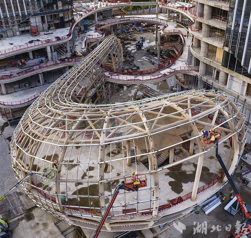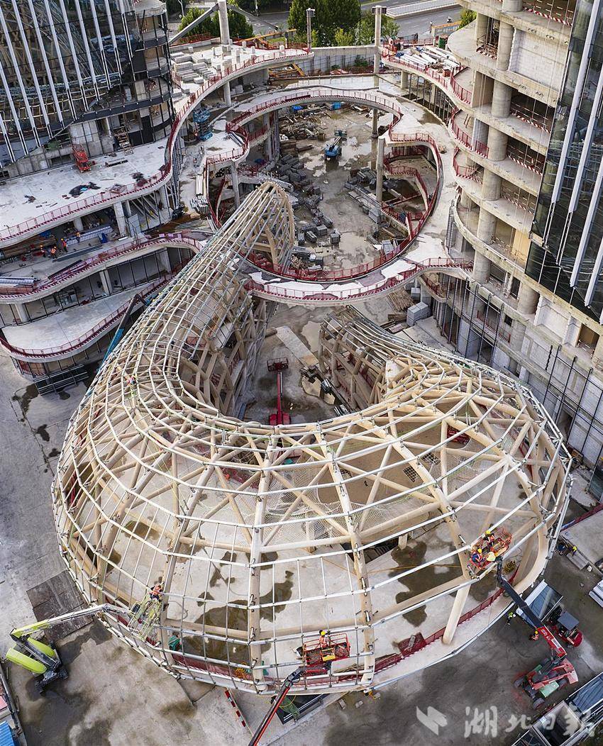 9月2日,鸟瞰位于武汉武昌滨江商务区的劲牌大厦项目,目前,大厦主体结构已全面封顶。其中T3商业裙楼主体设计成了三层高的流线型结构,裙楼内,粗细各异的钢柱相互交叉拼接,形成了一圈圈网状穹顶结构。整个钢结构从地面盘旋上升,直至与塔楼交汇,宛如在拐角处“拧”出了一节巨大的“麻花”。为了高度还原概念设计,几乎每一段钢柱都是定制的。(湖北日报全媒记者 朱熙勇 摄)